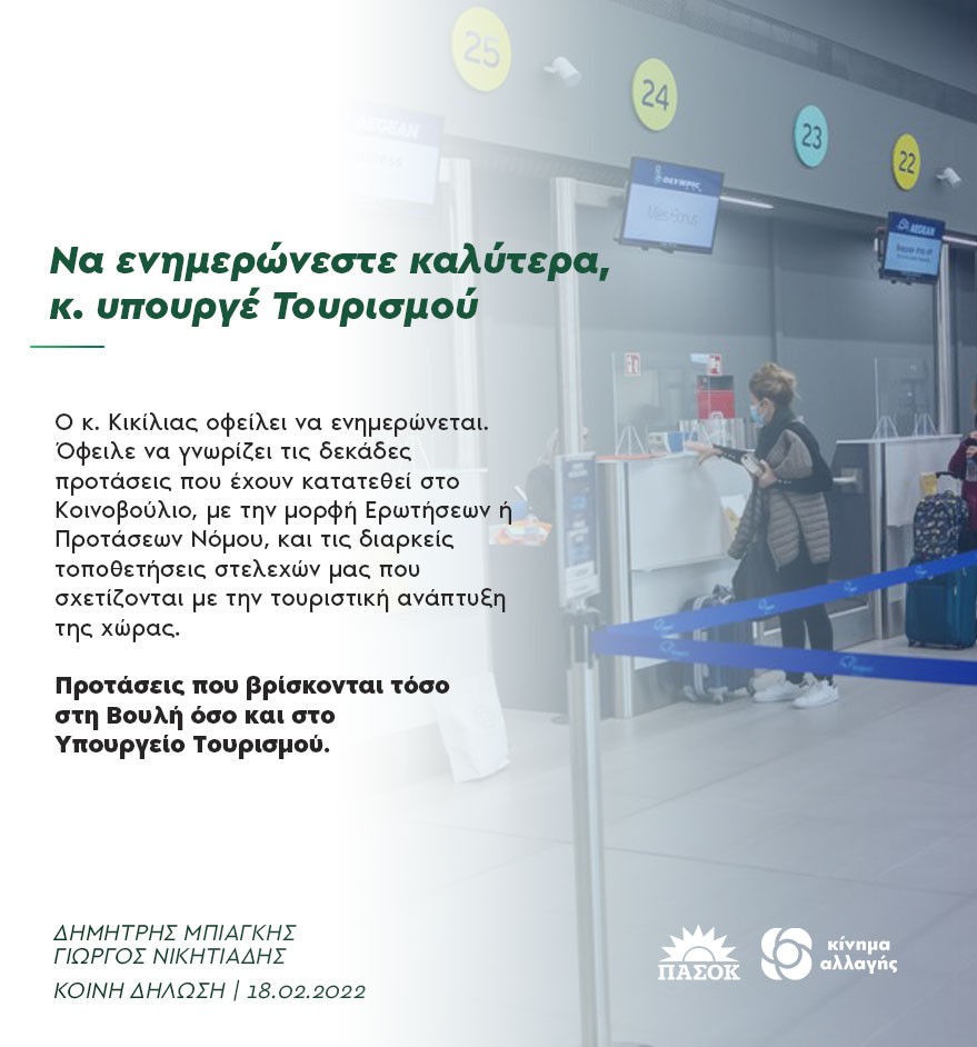 Με αφορμή την πρόσφατη δήλωση του Υπουργού Τουρισμού, κ. Βασίλη Κικίλια, απευθυνόμενη στον Πρόεδρο του ΠΑΣΟΚ-Κινήματος Αλλαγής, κ. Νίκο Ανδρουλάκη, με την οποία ζητάει τις προτάσεις του κόμματος για τον τουρισμό, ο Bουλευτής Κέρκυρας του Κινήματος Αλλαγής, Υπεύθυνος Κοινοβουλευτικού τομέα τουρισμού κ. Δημήτρης Μπιάγκης και ο Γραμματέας του τομέα Τουρισμού του Κινήματος Αλλαγής, κ. Γιώργος Νικητιάδης απάντησαν τα εξής: