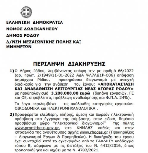 Η περίληψη της διακήρυξης, ανακοινώνει τη διενέργεια διαγωνισμού με ανοικτή διαδικασία για την εκτέλεση του έργου: «Αποκατάσταση και αναβάθμιση λειτουργίας Νέας Αγοράς Ρόδου» με αρχικό εκτιμώμενο προϋπολογισμό τριών εκατομμυρίων διακοσίων χιλιάδων ευρώ (3.200.000,00€), στο οποίο περιλαμβάνεται η δαπάνη εργασιών, ΓΕ και ΟΕ, απρόβλεπτα, πρόβλεψη αναθεώρησης και Φ.Π.Α. 24%. Το έργο, αφορά στις κατηγορίες εργασιών οικοδομικά και ηλεκτρομηχανολογικά.