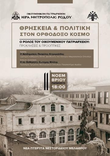 Διάλεξη μέ θέμα: «Θρησκεία καί Πολιτική στόν Ὀρθόδοξο Κόσμο. Ὁ ρόλος τοῦ Οἰκουμενικοῦ Πατριαρχείου: Προκλήσεις καί προοπτικές»