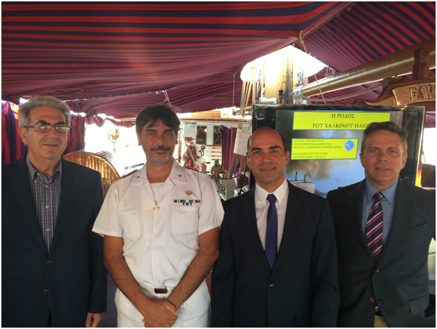 ΔΕΛΤΙΟ ΤΥΠΟΥ-Διάλεξη του Αναπληρωτή Καθηγητή κ. Σπύρου Συρόπουλου επάνω στο Ιταλικό εκπαιδευτικό πλοίο «Palinuro» 7/09/2017 -Στο εκπαιδευτικό πλοίο «Palinuro» του Ιταλικού Πολεμικού Ναυτικού βρέθηκε το απόγευμα της Τετάρτης 6 Σεπτεμβρίου ο Αναπληρωτής Καθηγητής του Τμήματος Μεσογειακών Σπουδών και Αντιπρύτανης Διεθνών Συνεργασιών του Πανεπιστημίου Αιγαίου κ. Σπύρος Συρόπουλος. Η επίσκεψη ήταν προγραμματισμένη και καλά οργανωμένη από τον Επίτιμο Πρόξενο της Ιταλίας στη Ρόδο κ. Νικόλαο Φαρμακίδη, καθώς ο καθηγητής έδωσε μία διάλεξη στους εκπαιδευόμενους του πλοίου σχετικά με την ιστορία της Ρόδου και το Χάλκινο άγαλμα του Θεού Ήλιου, του γνωστού Κολοσσού της Ρόδου, με παράλληλη παρουσίαση υλικού με powerpoint αλλά και ζωντανή μετάφραση στα ιταλικά από τον Υποψήφιο Διδάκτορα του Πανεπιστημίου Αιγαίου κ. Τάσο Χαμουζά. Ο αέρας που φυσούσε και το έντονο κούνημα του καραβιού δεν εμπόδισαν ούτε τους εκπαιδευόμενους ούτε τους επισκέπτες, μεταξύ των οποίων και ο Αντιδήμαρχος Ρόδου κ. Σάββας Διακοσταματίου, να καθίσουν και να απολαύσουν την πολύ ενδιαφέρουσα διάλεξη μέσα σ’ ένα πλοίο όπου συναντήθηκαν οι θρύλοι και μύθοι των αρχαίων θεών της Ιταλίας και της Ελλάδας. Η Αφροδίτη και ο Ποσειδώνας του Palinuroμε τον Δία και τον θεό Ήλιο της Ρόδου. Ο φιλόξενος καπετάνιος του “Palinuro”GiuzeppeValentiniεντυπωσιασμένος ανέφερε ότι πρώτη φορά επισκέπτεται καθηγητής το πλοίο και δίνει διάλεξη επάνω σ’ αυτό και ευχαριστώντας τον κ. Συρόπουλο αλλά και τον συνεργάτη/μεταφραστή κ. Χαμουζά τους δώρισε από ένα Λεύκωμα για το Ιταλικό Πολεμικό Ναυτικό. Η εκδήλωση τελείωσε μέσα σ’ ένα ειδυλλιακό απόγευμα, όπου πάνω από το κατάστρωμα του πλοίου μέσα από τα κατάρτια και τα σχοινιά αχνοφαίνονταν τα τείχη της Παλιάς Πόλης καθώς πίσω τους μας αποχαιρετούσαν οι τελευταίες ακτίνες του ήλιου σα να επιβεβαίωναν την ιστορία που μόλις πριν από λίγο είχε ειπωθεί γι’ αυτόν.
