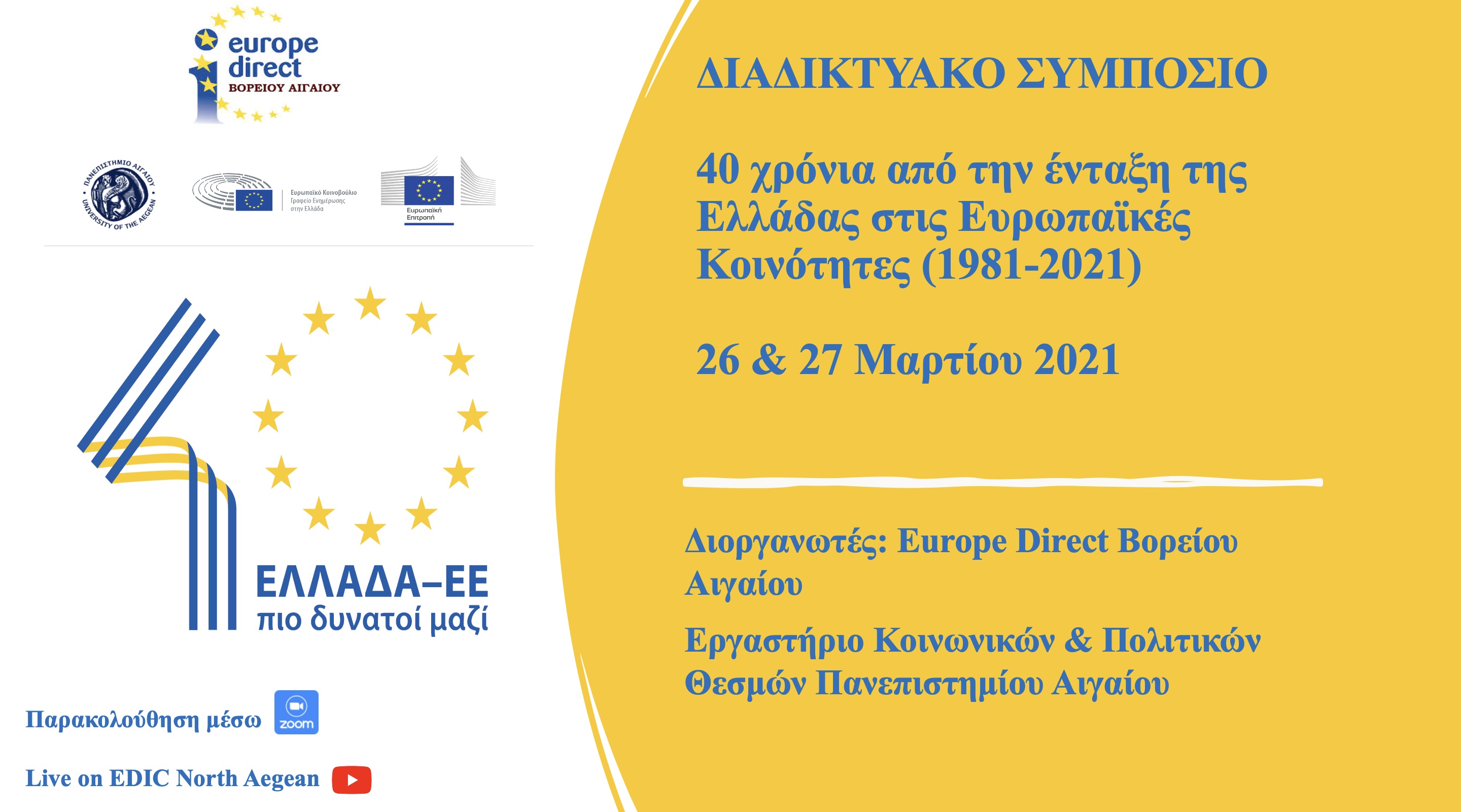 Στο πλαίσιο της συμπλήρωσης 40 χρόνων από την ένταξη της Ελλάδας στις Ευρωπαϊκές Κοινότητες, το Europe Direct Βορείου Αιγαίου σε συνεργασία με το Εργαστήριο Κοινωνικών & Πολιτικών Θεσμών του Τμήματος Κοινωνιολογίας του Πανεπιστημίου Αιγαίου, διοργανώνουν ένα διήμερο διαδικτυακό Συμπόσιο με θέμα: