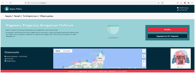 Στο Πλαίσιο του ψηφιακού εκσυγχρονισμού του Δήμου Ρόδου, έχει τεθεί σε εφαρμογή ηλεκτρονική πλατφόρμα για την άμεση υποβολή αιτημάτων από τους δημότες (https://aitimata.rhodes.gr/), χωρίς να είναι αναγκαία η φυσική παρουσία τους στον Οργανισμό.