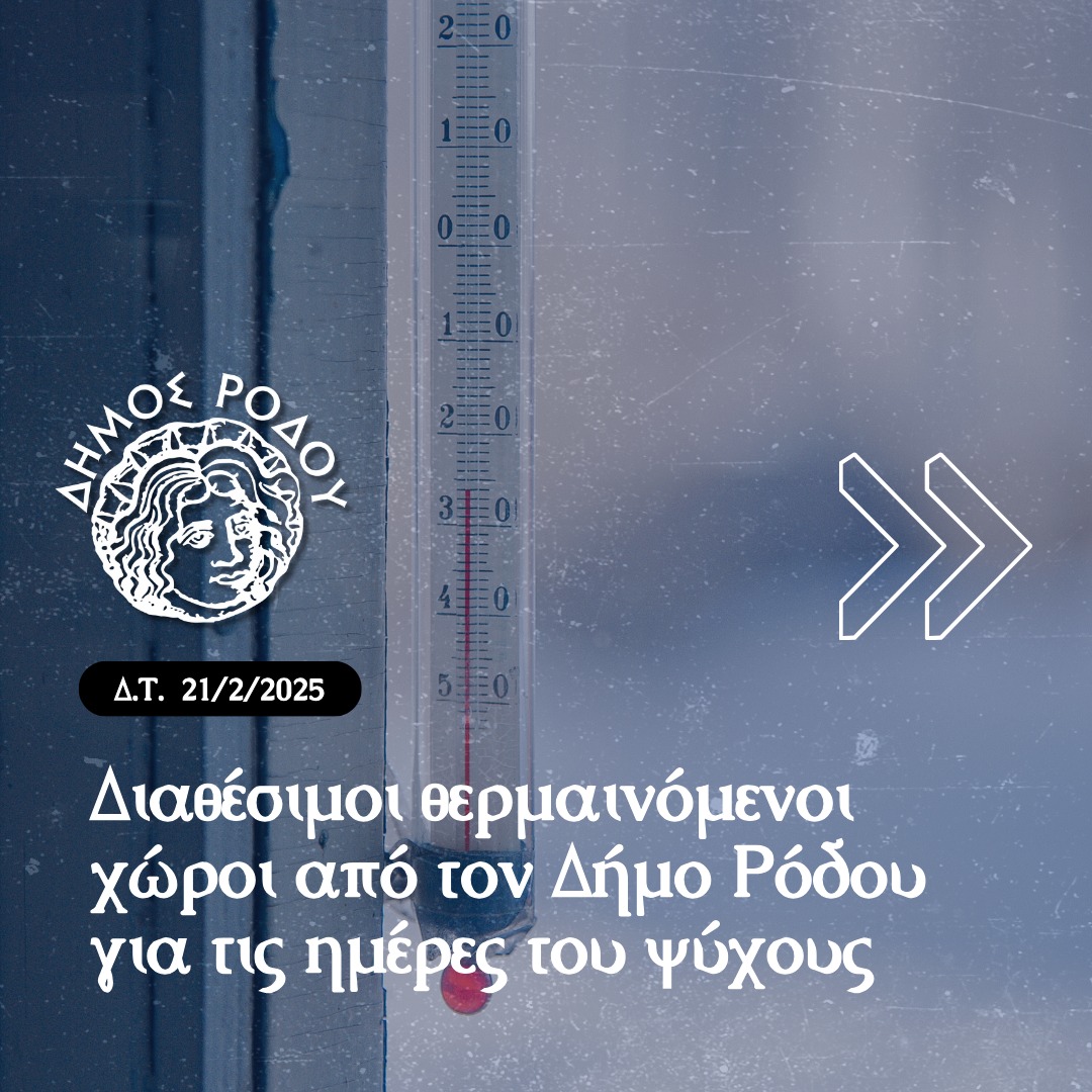 Ο Δήμος Ρόδου ενημερώνει τους πολίτες ότι, λόγω των χαμηλών θερμοκρασιών που θα διαρκέσουν έως και την Κυριακή 23 Φεβρουαρίου, από αύριο Σάββατο 22 Φεβρουαρίου θα διατεθούν θερμαινόμενοι χώροι για την εξυπηρέτηση των ευάλωτων και ευπαθών ομάδων.