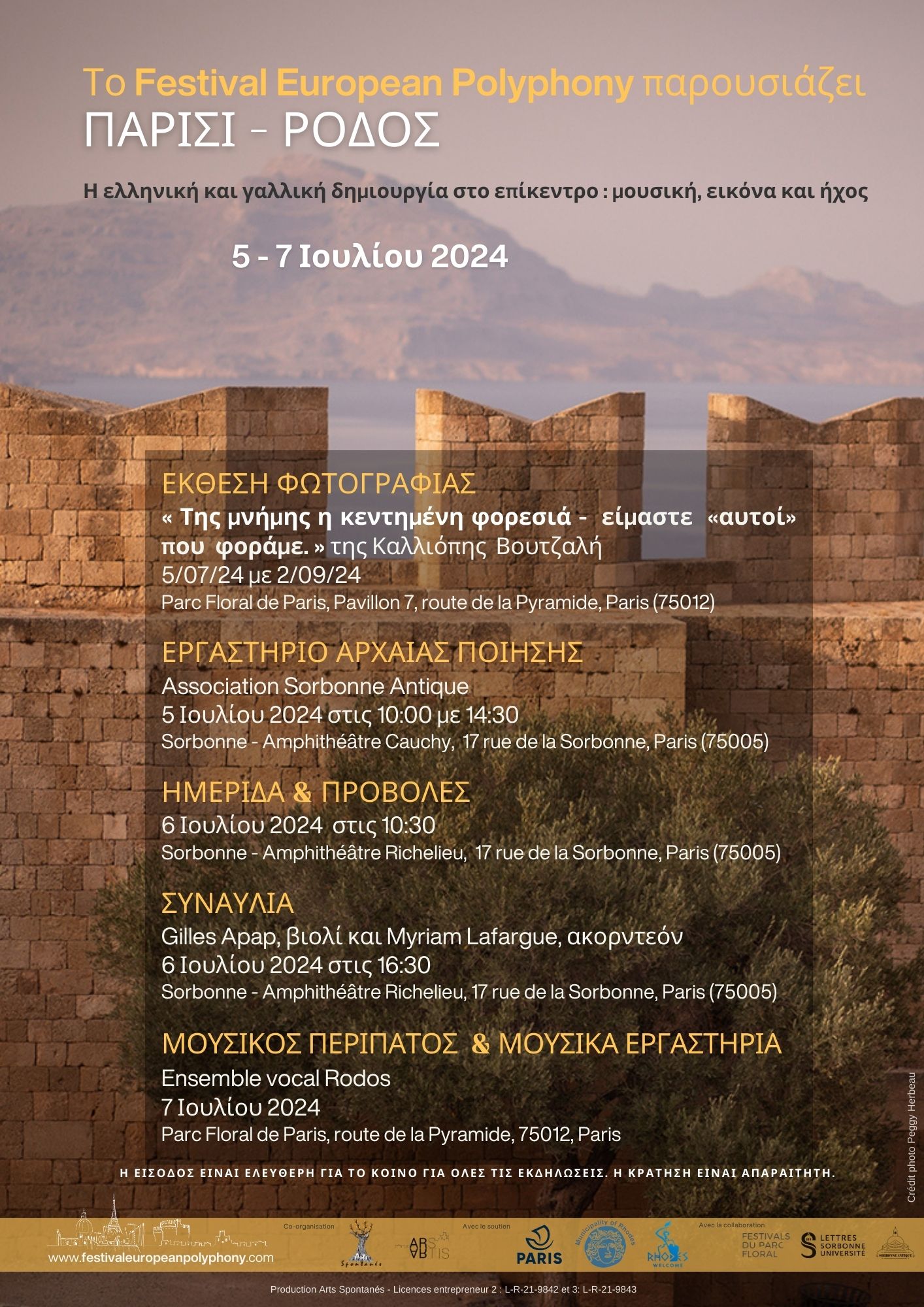 Ανακαλύψτε ένα καθηλωτικό πρόγραμμα σε εμβληματικούς χώρους στη καρδιά του Παρισιού, στο Πανεπιστήμιο της Σορβόννης και στο Parc Floral de Paris: Συναυλία με τον Gilles Apap και την Myriam Largue (βιολί και ακορντεόν αντίστοιχα), έναν μουσικό περίπατο και εργαστήρια με τους Rodos Vocal Ensemble , ένα εισαγωγικό εργαστήρι πάνω στην αρχαία ποίηση από τους φοιτητές μεταπτυχιακού του οργανισμού Sorbonne Antique, έκθεση φωτογραφίας « Της μνήμης η κεντημένη φορεσιά – είμαστε «αυτοί» που φοράμε. » της Καλλιόπη Βουτζαλή καθώς μία ημερίδα και προβολές.