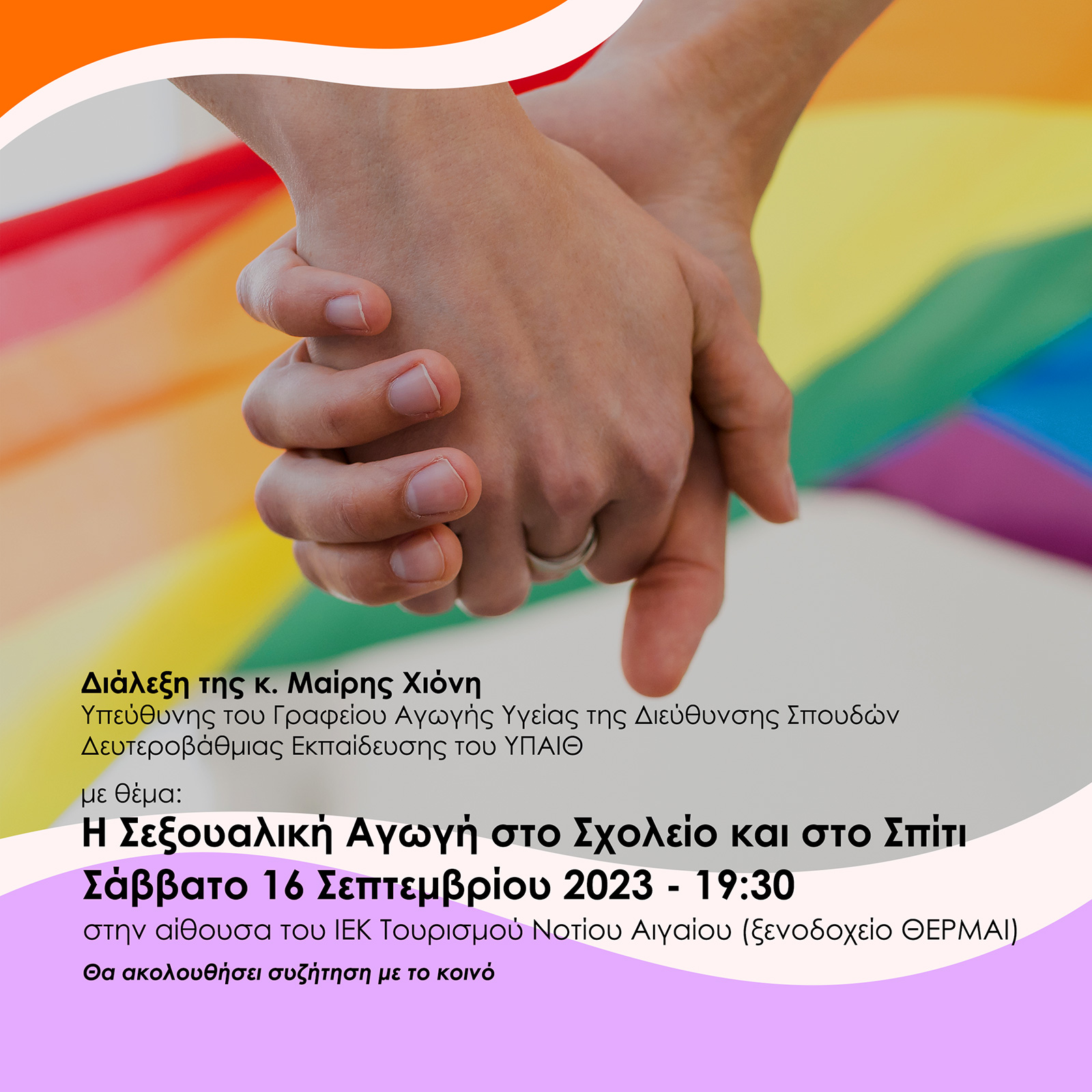 Το Σάββατο 16 Σεπτεμβρίου 2023 και ώρα 19:30 στην αίθουσα του ΙΕΚ Τουρισμού Νοτίου Αιγαίου (ξενοδοχείο ΘΕΡΜΑΙ) θα πραγματοποιηθεί ανοιχτή εκδήλωση -συζήτηση για Εκπαιδευτικούς, Γονείς, Κηδεμόνες, Φοιτητές με θέμα: θέμα: “Η Σεξουαλική Αγωγή στο Σχολείο και στο Σπίτι”.