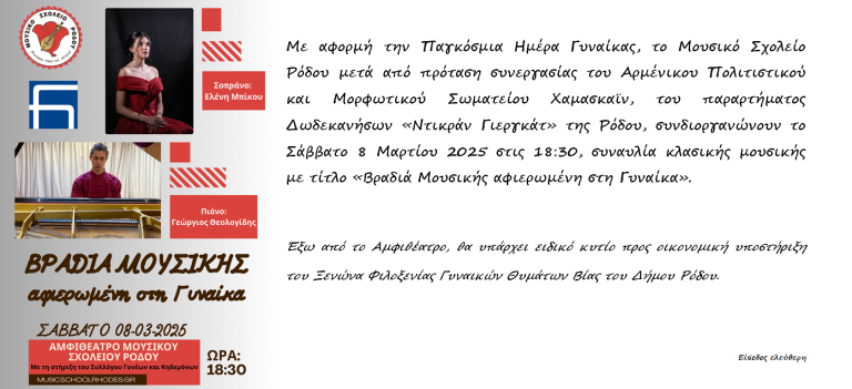 - Σάββατο 8 Μαρτίου στις 18:30 στο Mουσικό Σχολείο Ρόδου
