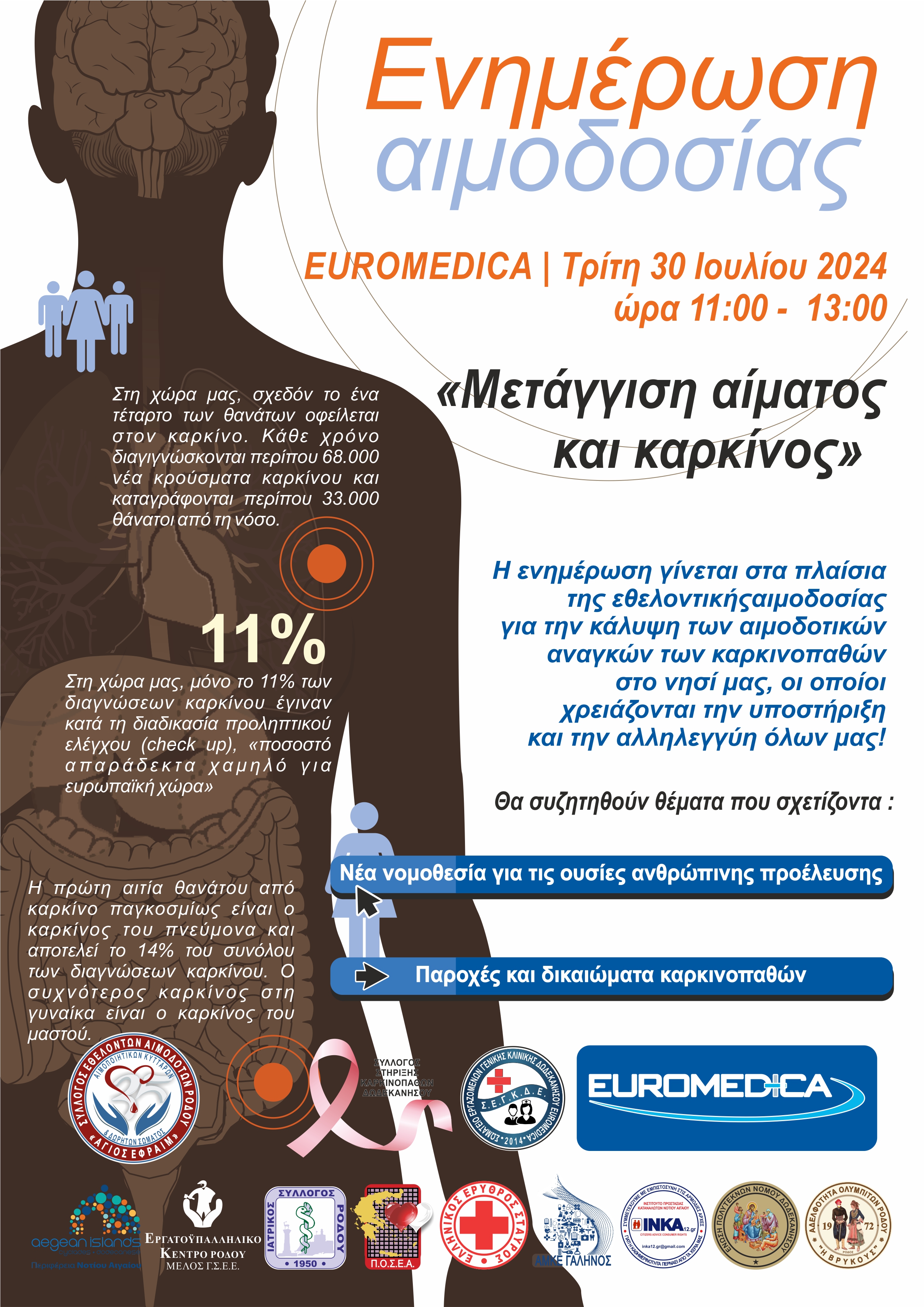 Ο Σύλλογος Αιμοδοτών Ρόδου, σε συνεργασία με τη EUROMEDICA ΡΟΔΟΥ, το Σύλλογο Στήριξης Καρκινοπαθών Δωδεκανήσου, το Σωματείο Εργαζομένων Euromedica Ρόδου και την υποστήριξη της Περιφέρειας Νοτίου Αιγαίου, του Εργατοϋπαλληλικού Κέντρου Ρόδου, τον Ιατρικό Σύλλογο Ρόδου, την Π.Ο.Σ.Ε.Α., το Παράρτημα Ρόδου του ΕΕΣ, την ΑΜΚΕ ΓΑΛΗΝΟΣ, το ΙΝ.ΚΑ. Δωδεκανήσου, την Ένωση Πολυτέκνων Δωδεκανήσου και την Αδελφότητα Ολυμπιτών Ρόδου "Η ΒΡΥΚΟΥΣ", οργανώνει στο χώρο της κλινικής δύο σημαντικές εκδηλώσεις: