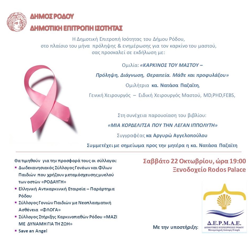 Την ίδια μέρα η Δημοτική Επιτροπή Ισότητας του Δήμου Ρόδου διοργανώνει εκδήλωση στο Rodos Pallas (αίθουσα Δελφοί) στις 19:00 με κεντρική ομιλήτρια την κα. Νατάσα Παζαϊτη, Γενική Χειρουργό – Ειδική Χειρουργό Μαστού, MD,PHD,FEBS με θέμα ομιλίας: «ΚΑΡΚΙΝΟΣ ΤΟΥ ΜΑΣΤΟΥ – Πρόληψη, Διάγνωση, Θεραπεία. Μάθε και προφυλάξου». Θα πραγματοποιηθεί, επίσης, παρουσίαση του βιβλίου της συγγραφέας κα Αργυρώ Αγγελοπούλου: «ΜΙΑ ΚΟΡΔΕΛΙΤΣΑ ΠΟΥ ΤΗΝ ΛΕΓΑΝ ΙΠΠΟΛΥΤΗ», στο οποίο συμμετέχει με σημείωμα προς την μητέρα η κα. Νατάσα Παζαϊτη. Στη συνέχεια οι αντικαρκινικοί σύλλογοι, Δωδεκανησιακός Σύλλογος Γονέων και Φίλων Παιδιών που χρήζουν μεταμόσχευσης μυελού των οστών «ΡΟΔΑΥΓΗ», Ελληνική Αντικαρκινική Εταιρεία – Παράρτημα Ρόδου, Σύλλογος Γονιών Παιδιών με Νεοπλασματική Ασθένεια «ΦΛΟΓΑ», Σύλλογος Στήριξης Καρκινοπαθών Ρόδου «ΜΑΖΙ ΜΕ ΔΥΝΑΜΗ ΓΙΑ ΤΗ ΖΩΗ», Save an Angel, αφού παρουσιάσουν το έργο τους, θα τιμηθούν για την κοινωνική προσφορά τους.