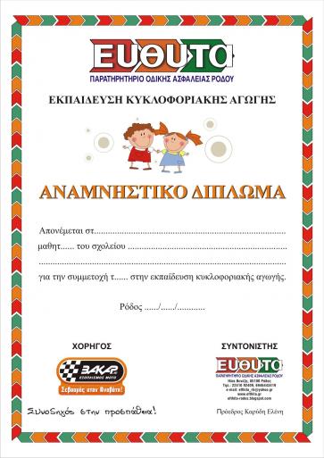 Σύνολο μαθητών: 1.515 μαθητές Π/θμιας και Δ/θμιας εκπαίδευσης. Σε όλους τους μαθητές διανέμονται Αναμνηστικά Διπλώματα παρακολούθησης του εκπαιδευτικού προγράμματος και έντυπα με συμβουλές στους γονείς,για την ασφαλή μετακίνηση των παιδιών και έντυπα με συμβουλές ασφαλώς ποδηλατώ. ΧορηγοίΒΑΚΑΡ Αντώνης Βαρέλης,Ασφάλειες MyΑσφάλειες και Ασφάλειες Μ. Σπανουδάκης.