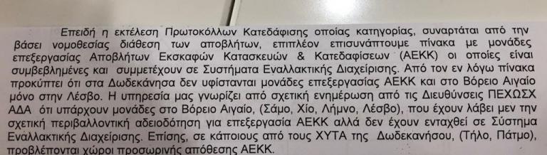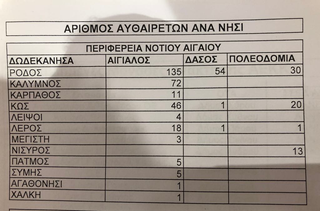 Στην Αποκεντρωμένη Διοίκηση Αιγαίου υπάρχουν 421 πρωτόκολλα κατεδάφισης για αυθαίρετες κατασκευές σε αιγιαλό, δάση και άλλους χώρους και περιμένουν να υλοποιηθούν, να εφαρμοστούν και να γκρεμιστούν όλες οι αυθαίρετες κατασκευές. Ο αριθμός είναι μεγάλο χωρίς βεβαία να προκαλεί εντύπωση αφού μια ματιά να ρίξεις αντιλαμβάνεσαι τι έχει γίνει...Πρώτη και με διάφορα η Ρόδος, ακολουθεί η Κάλυμνος, με τρίτη τη Κω και τέταρτη την Λέρο. Αναλυτικά: Ρόδος Αιγιαλός 135 Δάσος 54 Πολεοδομία 30 Κάλυμνος Αιγιαλός 72 Κάρπαθος Αιγιαλός 11 Κως Αιγιαλός 46 Δάση 1 Πολεοδομία 20 Λειψοι Αιγιαλός 4 Λέρος Αιγιαλός 18 Δάση 1 ΠΟλεοδομία 1 Μεγίστη Αιγιαλός 3 Νίσυρος Πολεοδομία 13 Πάτμος Αιγιαλός 5 Σύμη Αιγιαλός 5 Αγαθονήσι Αιγιαλός 1 Χάλκη Αιγιαλός 1