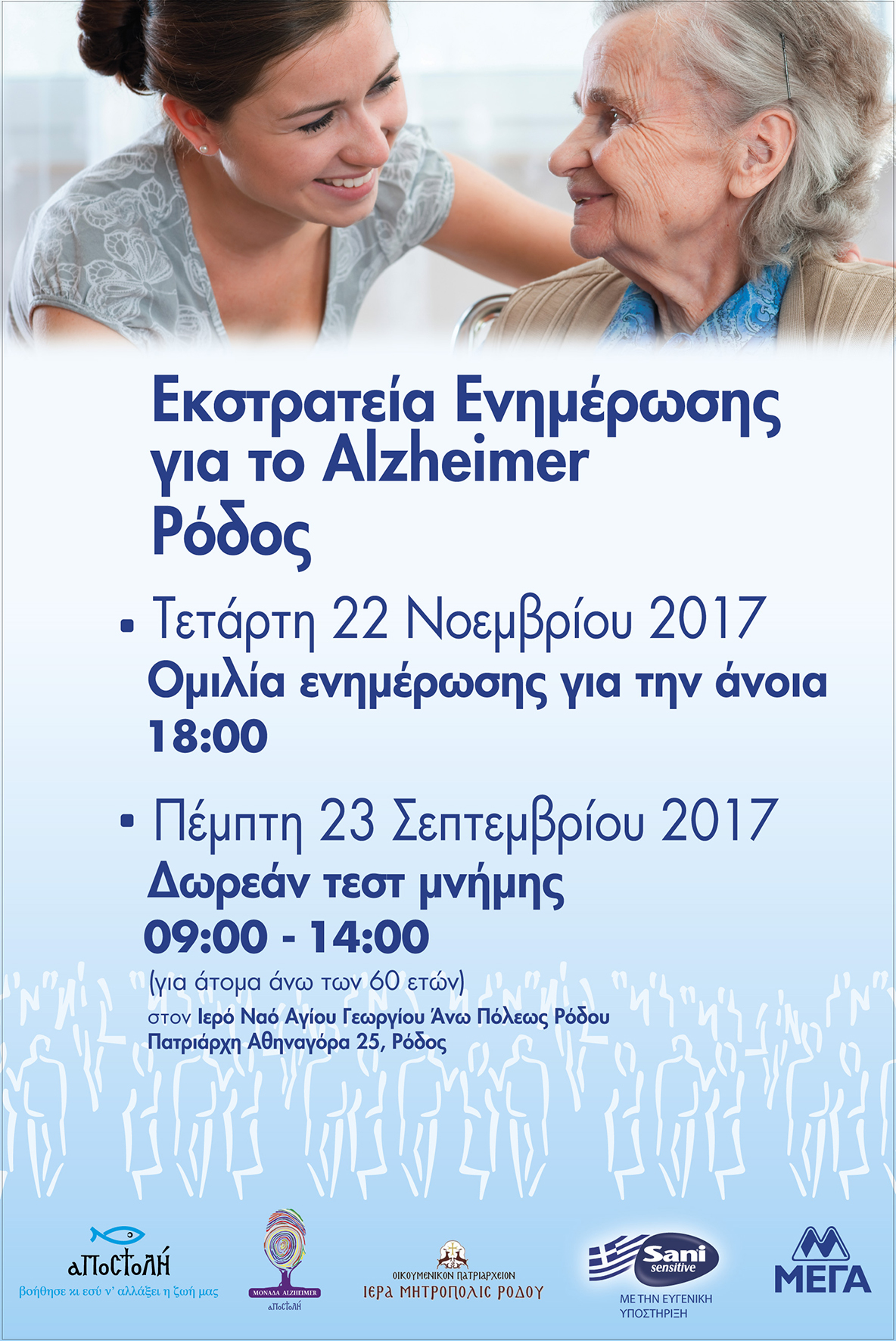 ΔΕΛΤΙΟ ΤΥΠΟΥ-Δωρεάν τεστ μνήμης και ενημερωτική ομιλία για την άνοια στη Ρόδο από το ΚΑΡΕΛΛΕΙΟ-ΜΟΝΑΔΑ ALZHEIMER του Φιλανθρωπικού Οργανισμού «ΑΠΟΣΤΟΛΗ» της Ιεράς Αρχιεπισκοπής Αθηνών και την εταιρεία ΜΕΓΑ -Χαλάνδρι, 02-11-17 Με την ευλογία και την προτροπή του Μακαριωτάτου Αρχιεπισκόπου Αθηνών κ.κ. Ιερωνύμου του Β΄ ο Φιλανθρωπικός Οργανισμός «ΑΠΟΣΤΟΛΗ» της Ιεράς Αρχιεπισκοπής Αθηνών, υλοποιεί Εκστρατεία Ενημέρωσης και Ευαισθητοποίησης για το Alzheimer. Επισκέπτεται ακριτικές περιοχές και μεγάλες πόλεις της πατρίδας μας με στόχο την ανακούφιση του πόνου των συνανθρώπων μας, σε συνεργασία με τις κατά τόπους Ιερές Μητροπόλεις. Την 22η – 23η Νοεμβρίου 2017 η δράση θα βρεθεί στο νησί της Ρόδου, όπου θα χορηγηθούν δωρεάν τεστ μνήμης σε άτομα άνω των 60 ετών από το επιστημονικό προσωπικό του «Καρέλλειου –Μονάδα Alzheimer» του Φιλανθρωπικού Οργανισμού «ΑΠΟΣΤΟΛΗ», ενώ θα δοθεί ενημερωτική ομιλία σε σχέση με τη νόσο Alzheimer.