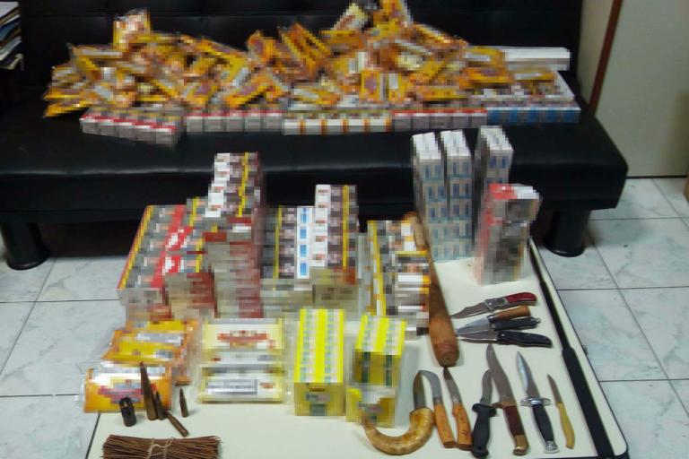 Ειδικότερα, στο πλαίσιο διερεύνησης υπόθεσης λαθρεμπορίου καπνικών προϊόντων, χθες το μεσημέρι πραγματοποιήθηκε στοχευμένος έλεγχος στην επιχείρηση που λειτουργεί ο 35χρονος και όπου βρέθηκαν επιμελώς κρυμμένα σε διάφορους χώρους: • -166- πακέτα τσιγάρων χωρίς ειδική ταινία φορολόγησης • -400- γραμμάρια συσκευασμένου καπνού χωρίς ειδική ταινία φορολόγησης • -4- φυσίγγια και φλογοκρύπτη πολεμικού τυφεκίου • Μεταλλική πτυσσόμενη ράβδος • Ξύλινο ρόπαλο • -10- μαχαίρια