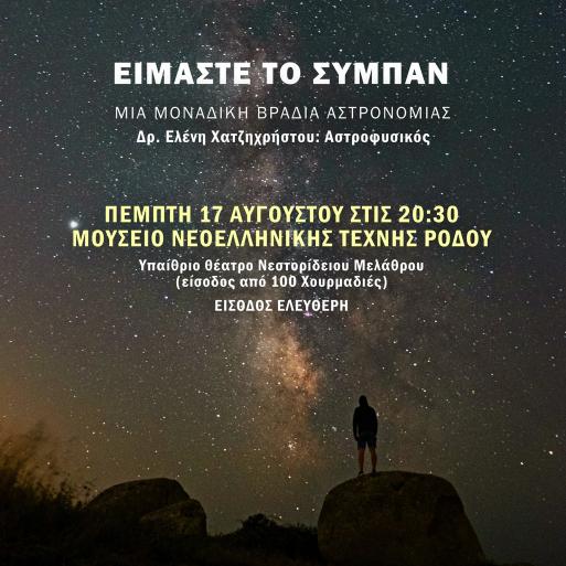 Η Κοινότητα Μονολίθου και η Ομάδα Εργασίας για την πιστοποίηση της Μονολίθου ως Διεθνούς Κοινότητας Σκοτεινού Ουρανού σας προσκαλούν σε μια μοναδική βραδιά αστρονομίας. Η Αστροφυσικός Δρ. Ελένη Χατζηχρήστου θα μας οδηγήσει σε ένα συναρπαστικό κοσμικό ταξίδι, που προσφέρει έμπνευση και στοχασμό για τα μυστήρια του Σύμπαντος και της ανθρώπινης ύπαρξης.