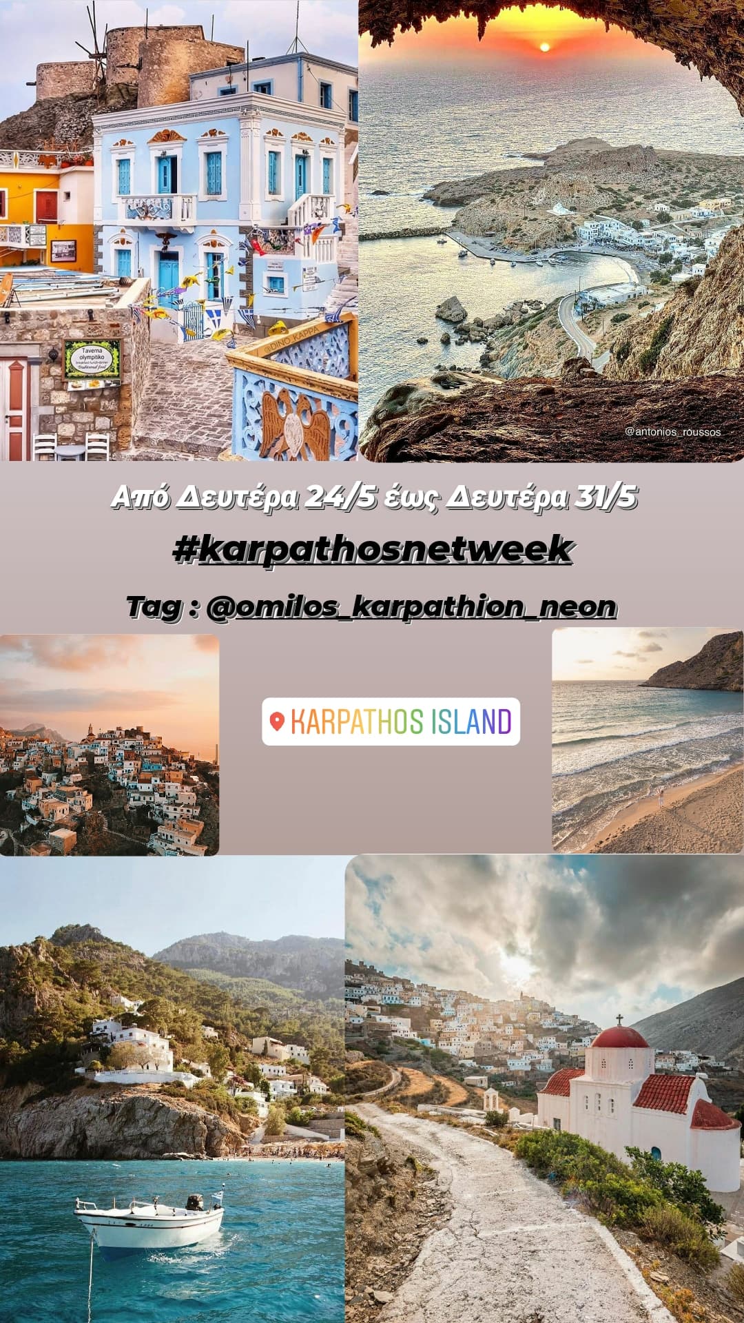 Από τη Δευτέρα 24 Μαΐου ο Όμιλος Καρπαθίων Νέων μας καλεί να «βομβαρδίσουμε» όλους τους φίλους μας με φωτογραφίες, βίντεο και με όλα τα στοιχεία που αναδεικνύουν την ομορφιά και την πολιτιστική κληρονομιά της Καρπάθου, χρησιμοποιώντας τα hashtag #εβδομαδακαρπαθουστοδιαδικτυο #karpathosnetweek.