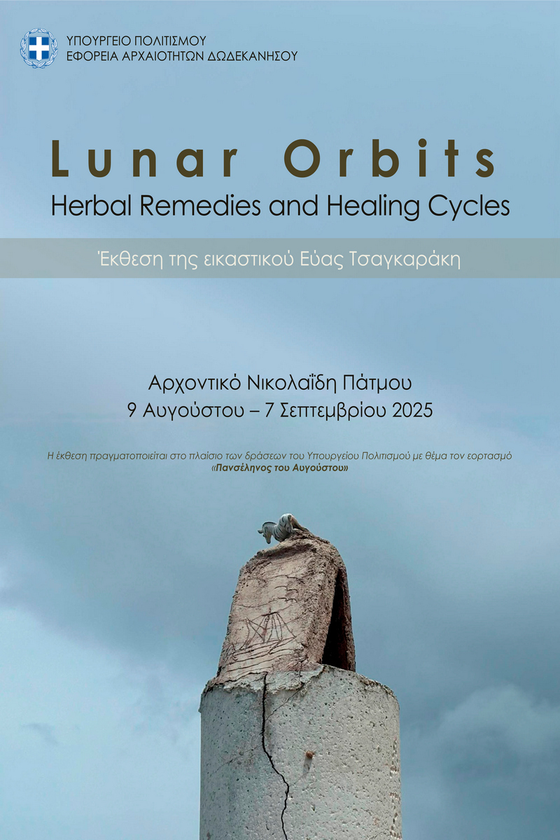 Θα ήταν ιδιαίτερη τιμή και χαρά για την Εφορεία Αρχαιοτήτων Δωδεκανήσου να παραστείτε στα εγκαίνια της εικαστικής έκθεσης της καλλιτέχνιδος κ. Εύας Τσαγκαράκη με τίτλο «Lunar orbits, Herbal Remedies and Healing Cycles» που θα πραγματοποιηθούν στο Αρχοντικό Νικολαΐδη στη Χώρα της Πάτμου, στις 9 Αυγούστου 2025 και ώρα 20.00.