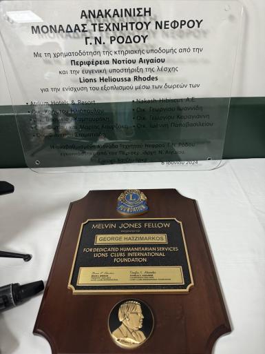 Σε ένδειξη της ευγνωμοσύνης της λέσχης Lions Helioussa Ρόδου για την άμεση ανταπόκριση στην ανάληψη της δέσμευσης του έργου και για την αποτελεσματικότητα στην εκτέλεσή του, το διοικητικό συμβούλιο αποφάσισε ομόφωνα να του απονέμει την ανώτατη διάκριση των διεθνών Lions. Πρόκειται για το βραβείο Melvin Jones Fellowship, που είναι η υψηλότερη μορφή αναγνώρισης των Lions, καθώς φέρει το όνομα του ιδρυτή και ενσωματώνει ανθρωπιστικές ιδέες που συνάδουν με τη φύση και το σκοπό του Λαΐονισμού. Ο αποδέκτης του βραβείου γίνεται πρότυπο λόγω της υποδειγματικής υπηρεσίας προς τον σύλλογο του και την κοινότητα για την οποία υπηρετεί.