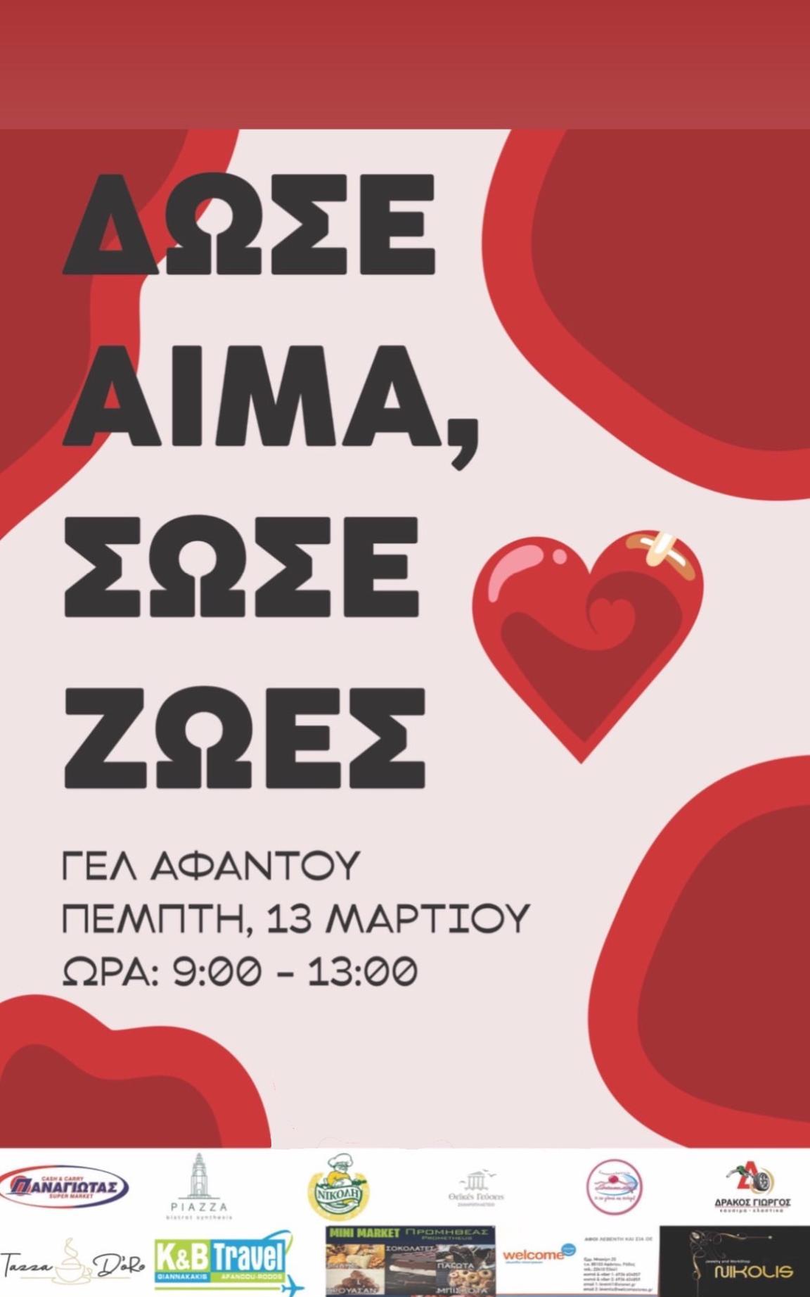 Ο Σύλλογος Εθελοντών Αιμοδοτών Ρόδου "Άγιος Εφραίμ" συγχαίρει το Γενικό Λύκειο Αφάντου για την αξιέπαινη πρωτοβουλία του να διοργανώσει, για άλλη μια φορά, Εθελοντική Αιμοδοσία στο χώρο του Σχολείου.