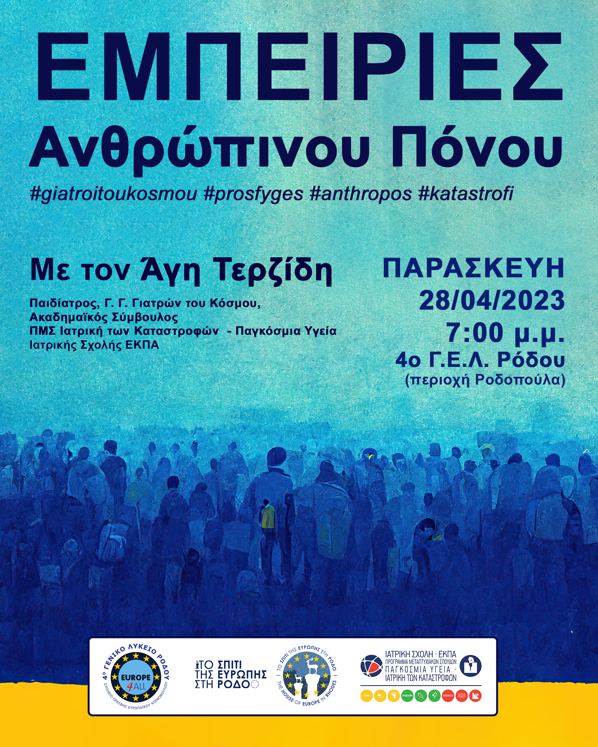 Το 4ο Γενικό Λύκειο Ρόδου - Σχολείο Πρέσβης του Ευρωπαϊκού Κοινοβουλίου, το Σπίτι της Ευρώπης στη Ρόδο και το Πρόγραμμα Μεταπτυχιακών Σπουδών της Ιατρικής Σχολής του ΕΚΠΑ "Ιατρική των Καταστροφών - Παγκόσμια Υγεία" παρουσιάζουν την εκδήλωση "Εμπειρίες Ανθρώπινου Πόνου" με ομιλητή τον Άγη Τερζίδη, Παιδίατρος, Γενικός Γραμματέας των Γιατρών του Κόσμου και Ακαδημαϊκός Σύμβουλος του ΠΜΣ "Ιατρική των Καταστροφών - Παγκόσμια Υγεία".