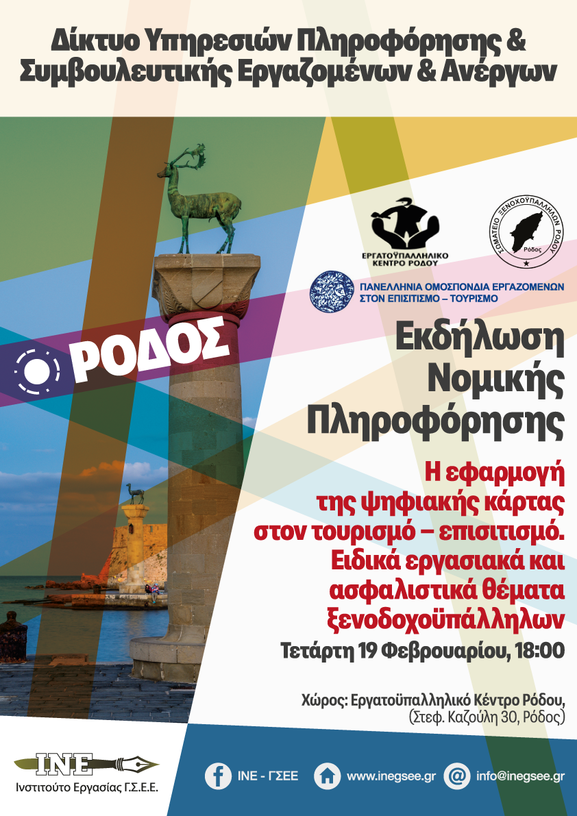 Tο Ινστιτούτο Εργασίας της ΓΣΕΕ / Περιφερειακό Νοτίου Αιγαίου σε συνεργασία με  το Εργατοϋπαλληλικό Κέντρο Ρόδου, την Πανελλήνια Ομοσπονδία Εργαζομένων στον Επισιτισμό - Τουρισμό και το Σωματείο Ξενοδοχοϋπαλλήλων Ρόδου συνδιοργανώνουν Εκδήλωση Νομικής Πληροφόρησης με θέμα: