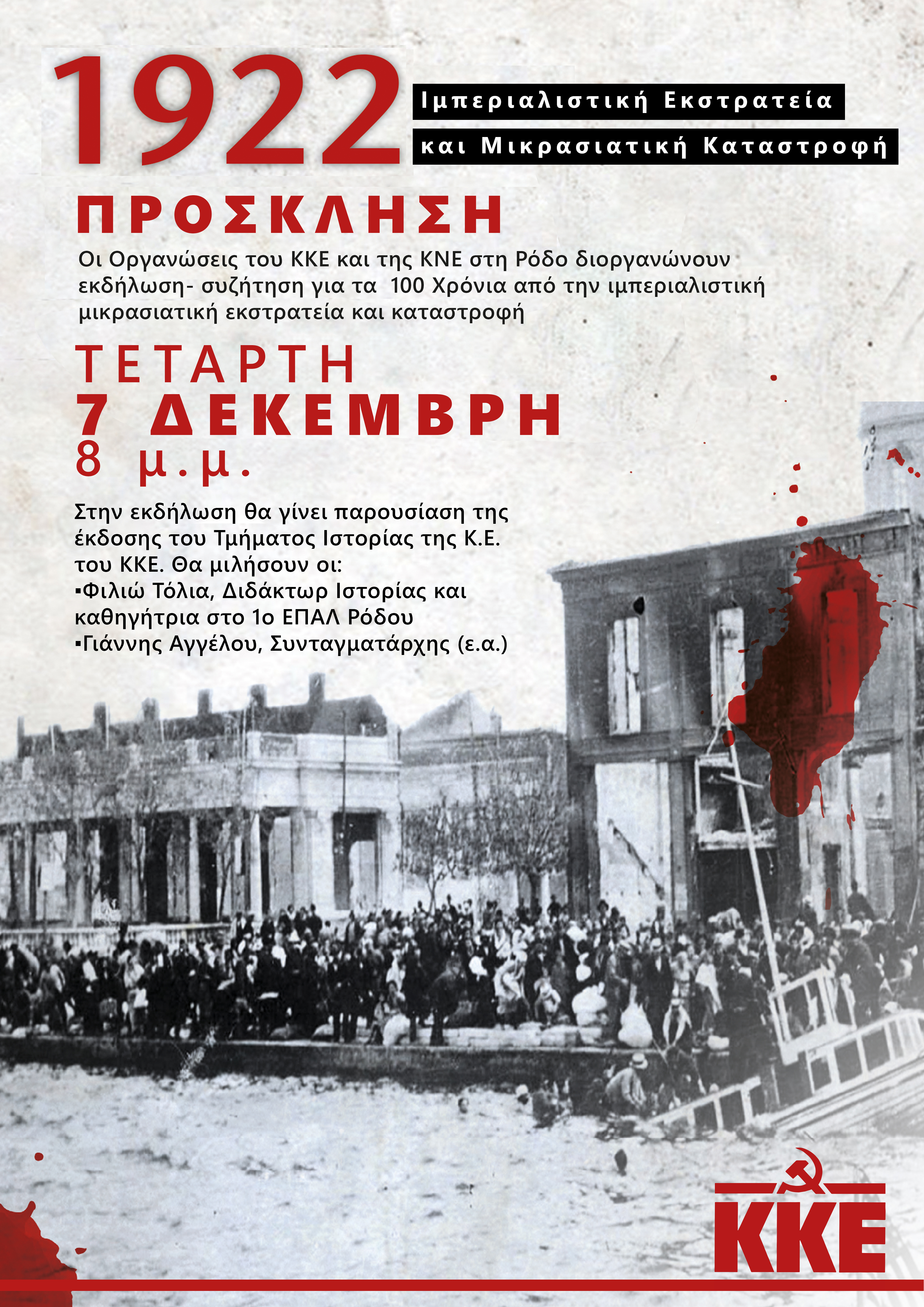 Οι Οργανώσεις του ΚΚΕ και της ΚΝΕ στη Ρόδο διοργανώνουν εκδήλωση- συζήτηση για τα 100 χρόνια από την ιμπεριαλιστική Μικρασιατική Εκστρατεία και Καταστροφή την Τετάρτη 7 Δεκέμβρη 8 μ.μ. στο ΠΑΝΕΠΙΣΤΗΜΙΟ.