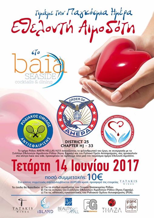 Το τμήμα Ρόδου AHEPA HELLAS HJ33 συνεχίζοντας το φιλανθρωπικό του έργο για το νησί μας, σε συνεργασία με το Συλλόγο Εθελοντών Αιμοδοτών Ρόδου (Άγιος Εφραίμ) και τον Ροδιακό Όμιλο Αντισφαίρισης (ΡΟΑ), σας προσκαλούν στο κέντρο baia sea side (έναντι Casino Ρόδου), την Τετάρτη 14 Ιουνίου 2017 και ώρα 20:00 προκειμένου να τιμήσουμε όλοι μαζί την Παγκόσμια Ημέρα Εθελοντή Αιμοδότη.
