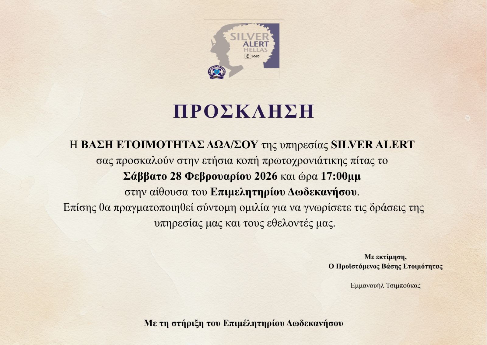 Με ιδιαίτερη χαρά και τιμή θα θέλαμε να σας προσκαλέσουμε στην Ετήσια Πρωτοχρονιάτικη Πίτα της Βάσης Ετοιμότητας Δωδεκανήσου Silver Alert.