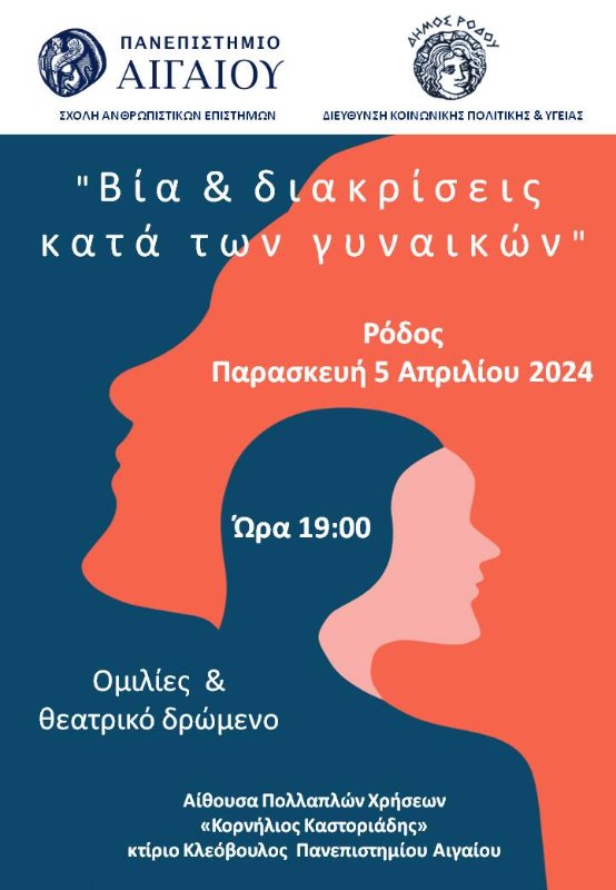 Η Σχολή Ανθρωπιστικών Επιστημών του Πανεπιστημίου Αιγαίου σε συνεργασία με τη Διεύθυνση Κοινωνικής Πολιτικής & Υγείας του Δήμου Ρόδου, φιλοξένησε με επιτυχία την εκδήλωση με θέμα "Βία και Διακρίσεις κατά των Γυναικών" την Παρασκευή, 05 Απριλίου 2024.
