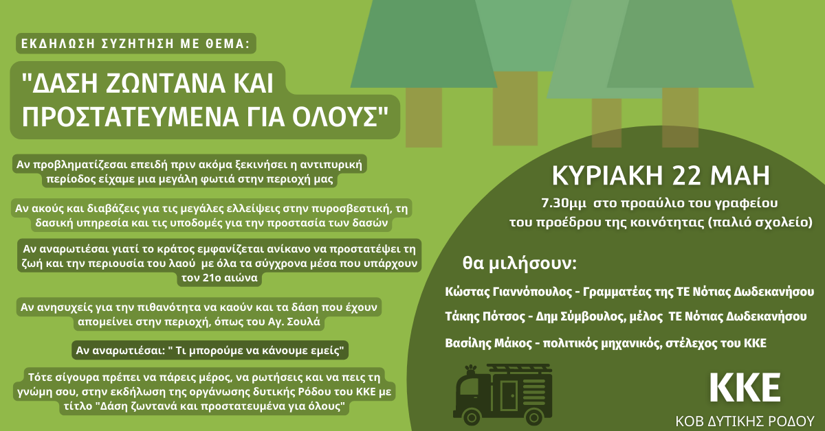 - Η κομματική οργάνωση δυτικής Ρόδου του ΚΚΕ, οργανώνει εκδήλωση με θέμα “Δάση ζωντανά και προστατευμένα για όλους”, στη Σορωνή, στο προαύλιο του γραφείου του προέδρου της κοινότητας (παλιό δημοτικό σχολείο), την Κυριακή 22 Μάη, 7.30 το απόγευμα.