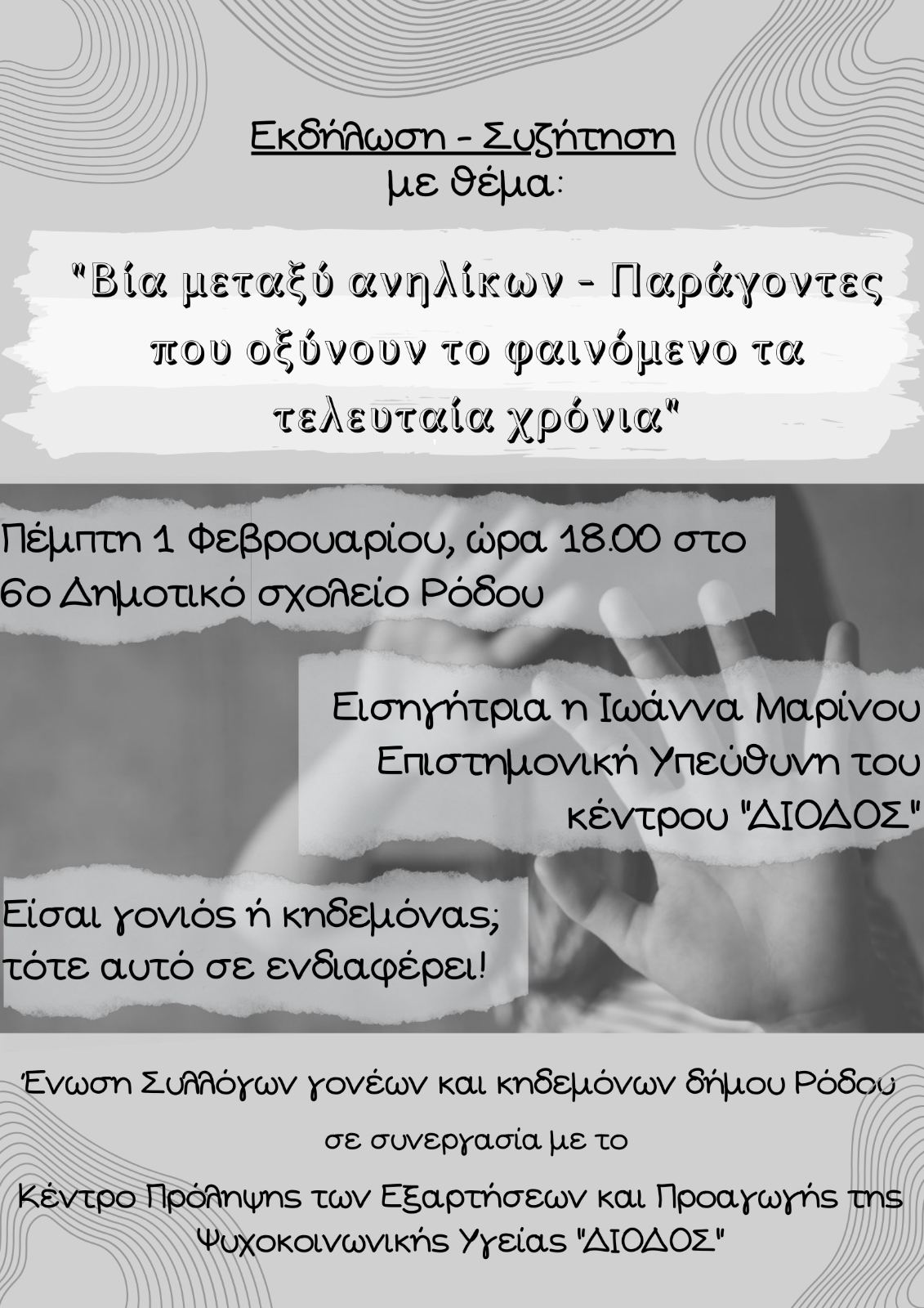 Η Ένωση Συλλόγων Γονέων Ρόδου σε συνεργασία με το Κέντρο Πρόληψης των Εξαρτήσεων και Προαγωγής της Ψυχοκοινωνικής Υγείας «ΔΙΟΔΟΣ» διοργανώνει εκδήλωση-συζήτηση με θέμα «Βία μεταξύ ανηλίκων – παράγοντες που οξύνουν το φαινόμενο τα τελευταία χρόνια», με εισηγήτρια την Ιωάννα Μαρίνου, επιστημονική Υπεύθυνη του κέντρου.