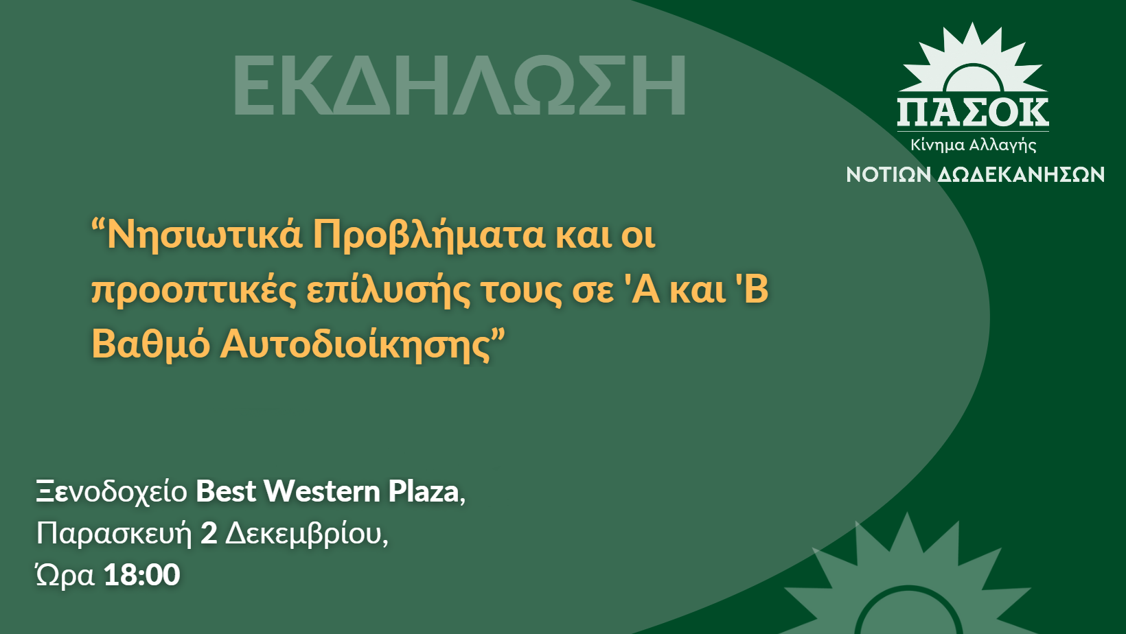 - Η Νομαρχιακή Επιτροπή ΠΑΣΟΚ – Κιν. Αλλαγής Νοτίων Δωδεκανήσων προσκαλεί τα μέλη και τους φίλους του στην εκδήλωση που διοργανώνει o Τομέας Αυτοδιοίκησης της Νομαρχιακής Επιτροπής με θέμα «Νησιωτικά προβλήματα και οι προοπτικές επίλυσής τους σε Ά και ΄Β Βαθμό Αυτοδιοίκησης» η οποία θα πραγματοποιηθεί την Παρασκευή 02-12-2022 και ώρα 18:00 στην αίθουσα εκδηλώσεων του ξενοδοχείου Best Western Plaza στη Ρόδο.