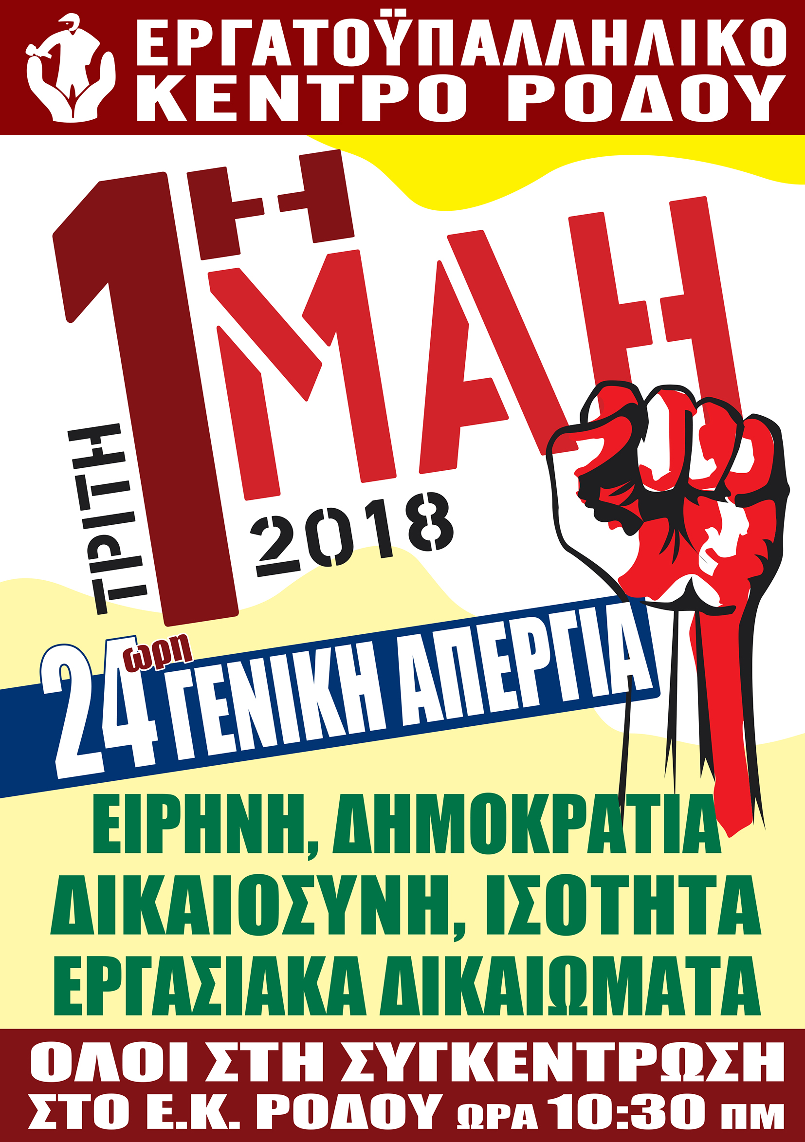 ΕΡΓΑΤΟΫΠΑΛΛΗΛΙΚΟ ΚΕΝΤΡΟ ΡΟΔΟΥ -ΔΕΛΤΙΟ ΤΥΠΟΥ -27/04/2018 -ΓΕΝΙΚΗ ΑΠΕΡΓΙΑ 1η ΜΑΗ -Το Εργατοϋπαλληλικό Κέντρο Ρόδου καλεί τους εργαζόμενους, τους άνεργους, τους νέους και τους συνταξιούχους της Ρόδου σε μαζική συμμετοχή στην πρωτομαγιάτικη απεργιακή συγκέντρωση που θα πραγματοποιηθεί την Τρίτη 1η Μαΐου 2018 στο Εργατικό Κέντρο Ρόδου και ώρα 10.00 π.μ. Ενωμένοι αγωνιζόμαστε για σταθερή και πλήρη εργασία για όλους, δίκαιο και βιώσιμο σύστημα κοινωνικής ασφάλισης, συντάξεις, παροχές, ελεύθερη συνδικαλιστική δράση, σεβασμό στους δημοκρατικούς θεσμούς, στα εργατικά δικαιώματα και τις εργασιακές κατακτήσεις. Αγωνιζόμαστε για ειρήνη, δημοκρατία, δικαιοσύνη, αξιοπρέπεια, ισότητα, εργασιακά δικαιώματα. Οι εργαζόμενοι, οι συνταξιούχοι, οι άνεργοι, ολόκληρη η ελληνική κοινωνία τα τελευταία χρόνια της κρίσης και των μνημονίων, δοκιμάζονται σκληρά και βάναυσα με τα προβλήματα και τις προκλήσεις να παραμένουν τεράστια. Γι' αυτό επιβάλλεται να δώσουμε αγωνιστικό -απεργιακό παρόν στο κάλεσμα του ΕΚΡ την Τρίτη 1η Μάη. Στα πλαίσια του εορτασμού θα λειτουργήσει στο ισόγειο του Εργατικού Κέντρου Έκθεση Ζωγραφικής με έργα μαθητών Γυμνασίων και Λυκείων της Ρόδου που οργανώνει το ΕΚΡ σε συνεργασία με την Α΄ ΕΛΜΕ ΔΩΔ/ΣΟΥ και την Δ/ΝΣΗ Β΄/ΘΜΙΑΣ ΕΚΠΑΙΔΕΥΣΗΣ ΔΩΔ/ΣΟΥ, με θέμα «ΕΙΡΗΝΗ – ΕΡΓΑΤΙΚΗ ΠΡΩΤΟΜΑΓΙΑ». Την εκδήλωση θα πλαισιώσουν μουσικά οι Ροδίτες καλλιτέχνες: Νεκτάριος Κωνσταντάκης (βιολί), Τάσος Νάνος (μπουζούκι), Φάνης Νάνος (πλήκτρα), Νεντζίπ Ατακλή (τραγούδι), Αγγελική Ροδίτη (τραγούδι), Νομική Στάππα (τραγούδι).
