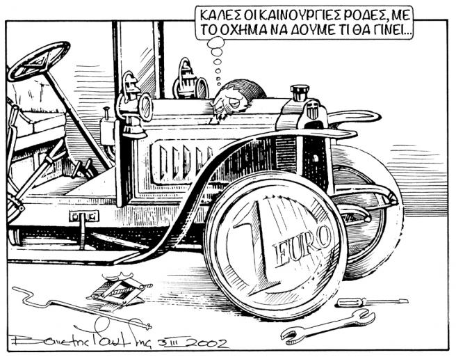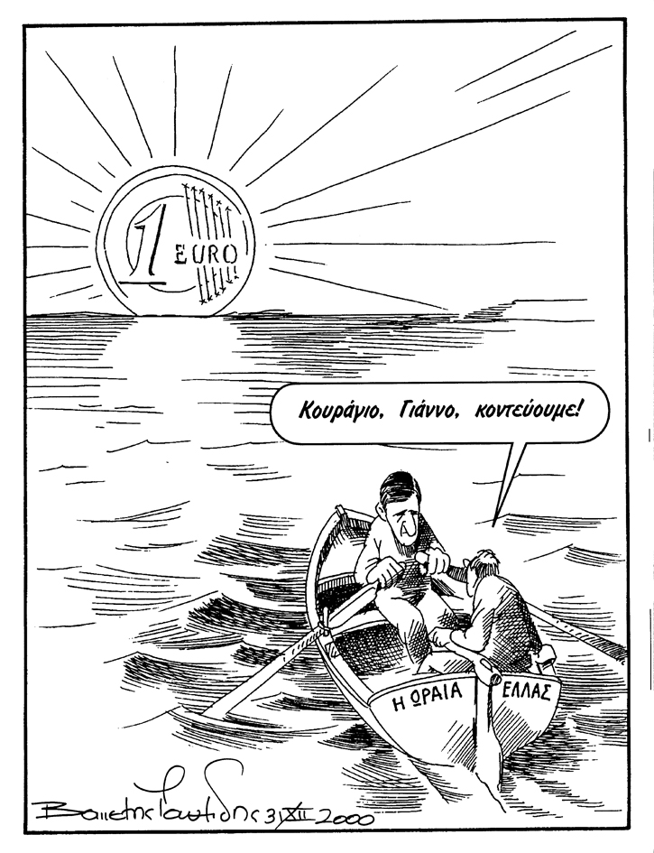 1η Μαρτίου 2002, κάποιες μέρες σαν και σήμερα, η Ελλάδα αποχαιρέτισε την δραχμή και το ΕΥΡΩ έγινε το επίσημο νόμισμα της χώρας. Χαράς ευαγγέλια! Η αίτηση για την ένταξη της χώρας στην ευρωζώνη είχε γίνει δυο χρόνια πριν, το 2000, απο τον τότε πρωθυπουργό Κ. Σημίτη. Δεν άντεξα στον πειρασμό και έκανα βουτιά στο αρχείο μου απ’ όπου ψάρεψα δυο σκίτσα εποχής: το ένα, 31 Δεκέμβρη 2000, Σημίτης και Παπαντωνίου κωπηλατούν προς τον ανατέλλοντα ήλιο. Στό άλλο, 3 Μάρτη 2002, διατυπώνεται η απορία του σκιτσογράφου που ακόμα δεν έχει απαντηθεί, 15 χρόνια αργότερα. Αμφότερα τα σκίτσα απο ΤΟ ΒΗΜΑ ΤΗΣ ΚΥΡΙΑΚΗΣ. pavlidiscartoons.com/blog