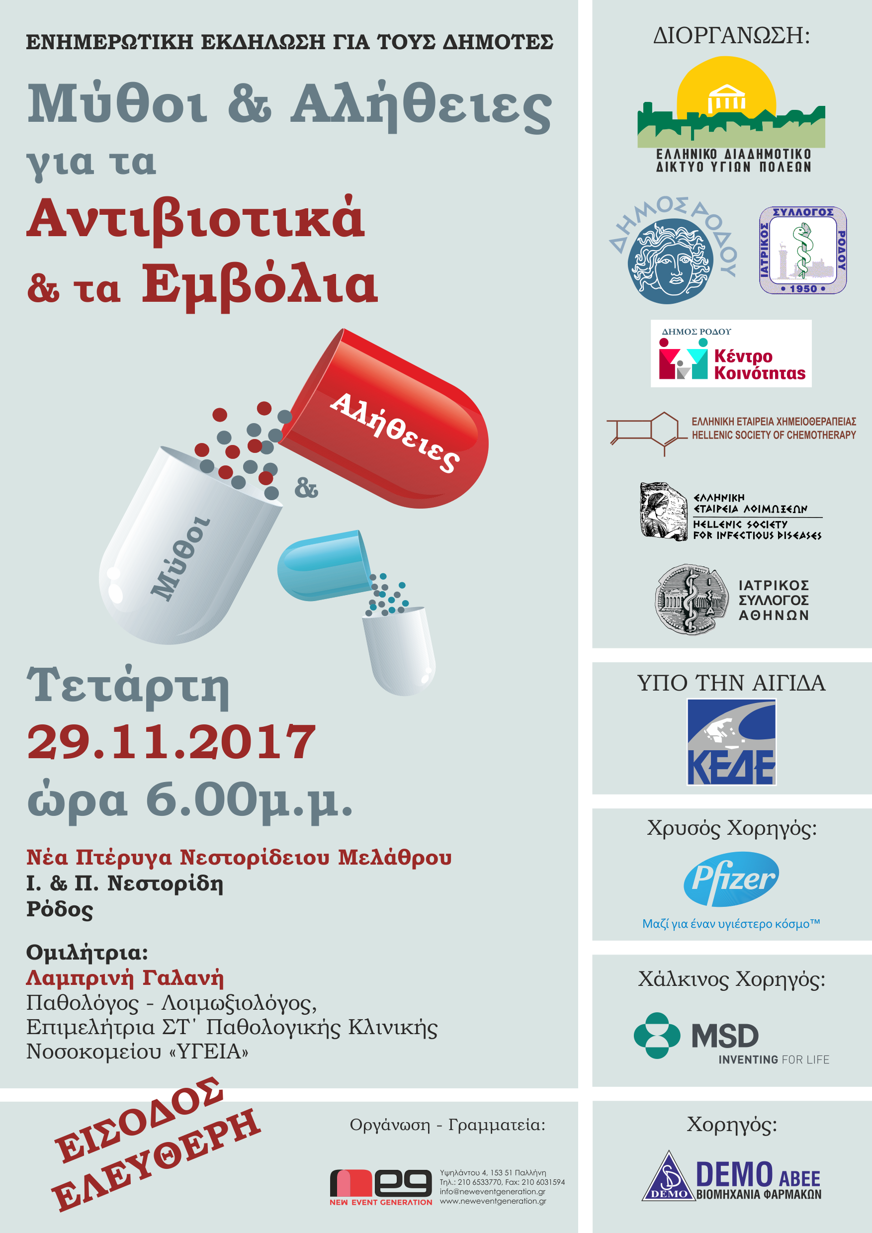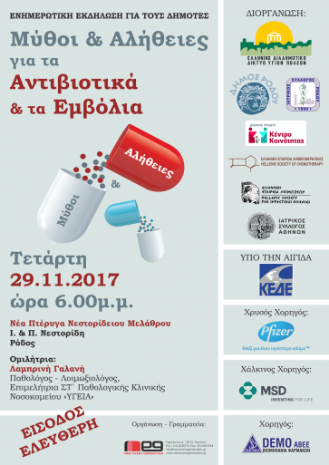 ΑΝΑΚΟΙΝΩΣΗ Ενημερωτική Εκδήλωση για τους Δημότες με θέμα: «Μύθοι & Αλήθειες για τα Αντιβιοτικά και τα Εμβόλια» πραγματοποιείται στο Δήμο Ρόδου, την Τετάρτη, 29 Νοεμβρίου 2017, ώρα 6.00μ.μ. στη Νέα Πτέρυγα Νεστορίδειου Μελάθρου, Ι. & Π. Νεστορίδη, Ρόδος. Η εκδήλωση υλοποιείται με τη συνδιοργάνωση του Δήμου Ρόδου, στο πλαίσιο της Εκστρατείας Ενημέρωσης για την Ορθή Χρήση των Αντιβιοτικών & των Εμβολίων που διοργανώνουν: το Ελληνικό Διαδημοτικό Δίκτυο Υγιών Πόλεων, η Ελληνική Εταιρεία Λοιμώξεων, η Ελληνική Εταιρεία Χημειοθεραπείας, ο Ιατρικός Σύλλογος Αθηνών και ο Ιατρικός Σύλλογος Ρόδου, υπό την Αιγίδα της Κεντρικής Ένωσης Δήμων Ελλάδας (ΚΕΔΕ). Στόχος της Εκστρατείας Ενημέρωσης είναι να γίνει κατανοητό και ξεκάθαρο από όλους τους Δημότες: • Πώς μπορούν και οι ίδιοι να συμβάλλουν στη μείωση της άσκοπης χρήσης αντιβιοτικών, μαθαίνοντας πότε πραγματικά χρειάζεται να πάρουν αντιβιοτικό και πότε όχι, • Ποιες είναι οι συνέπειες από την άσκοπη χρήση, • Πώς προλαμβάνονται οι λοιμώξεις μέσω των εμβολιασμών ώστε να μη νοσήσουν και να μη χρειαστεί τελικά να πάρουν αντιβιοτικό. Το θέμα θα αναπτύξει η κ. Λαμπρινή Γαλανή, Παθολόγος - Λοιμωξιολόγος, Επιμελήτρια ΣΤ΄ Παθολογικής Κλινικής Νοσοκομείου «ΥΓΕΙΑ». Η είσοδος είναι ελεύθερη για το κοινό.