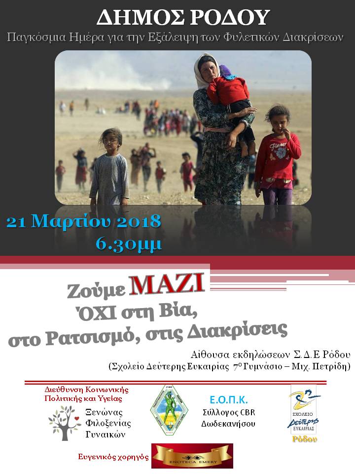 δελτίο τύπου - Ζούμε ΜΑΖΙ. ΟΧΙ στη Βία, στο Ρατσισμό, στις Διακρίσεις -Η 21η Μαρτίου καθιερώθηκε το 1966 από τον ΟΗΕ ως η Παγκόσμια Ημέρα για την Εξάλειψη των Φυλετικών Διακρίσεων. Στο πλαίσιο αυτό ο Δήμος Ρόδου με τον Ξενώνα Φιλοξενίας Γυναικών διοργανώνει ενημερωτική εσπερίδα με θέμα: «Ζούμε ΜΑΖΙ. ΟΧΙ στη Βία, στο Ρατσισμό, στις Διακρίσεις» την Τετάρτη 21 Μαρτίου και ώρα 6.30μμ στο Σχολείο Δεύτερης Ευκαιρίας (7ο Γυμνάσιο – Μιχαήλ Πετρίδη) Στελέχη του Ξενώνα Φιλοξενίας Γυναικών του Δήμου Ρόδου μαζί με τον κ. Δημήτρη Στεφανάκη, ψυχολόγο θα αναπτύξουν το θέμα γιατί μόνο αν ενώσουμε τις φωνές μας για τα θύματα του ρατσισμού, των φυλετικών διακρίσεων, της ξενοφοβίας και της μισαλλοδοξίας θα μπορέσουμε να ζήσουμε αρμονικά όλοι μαζί. Στην εσπερίδα θα συμμετάσχει και ο κ. Ντίνος Μαντικός, πρόεδρος του Συλλόγου CBR Δωδεκανήσου – Ε.Ο.Π.Κ. Στο τέλος της εκδήλωσης θα ακολουθήσει αραβική βραδιά με μουσική και εδέσματα που θα ετοιμαστούν από εθελόντριες πρόσφυγες γυναίκες. Η είσοδος είναι ελεύθερη