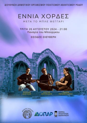 Την Τρίτη 20 Αυγούστου στις 21:00, το μουσικό σχήμα «Εννιά Χορδές» θα γεμίσει τον χώρο με έντεχνη ελληνική μουσική. Στο τραγούδι και στις κιθάρες οι Μιχάλης Μαντικός και Γιάννης Παπαθεοδώρου. Θα συνοδεύει με λύρα με συμπαθητικές χορδές ο Κωστής Αντωνιάδης.