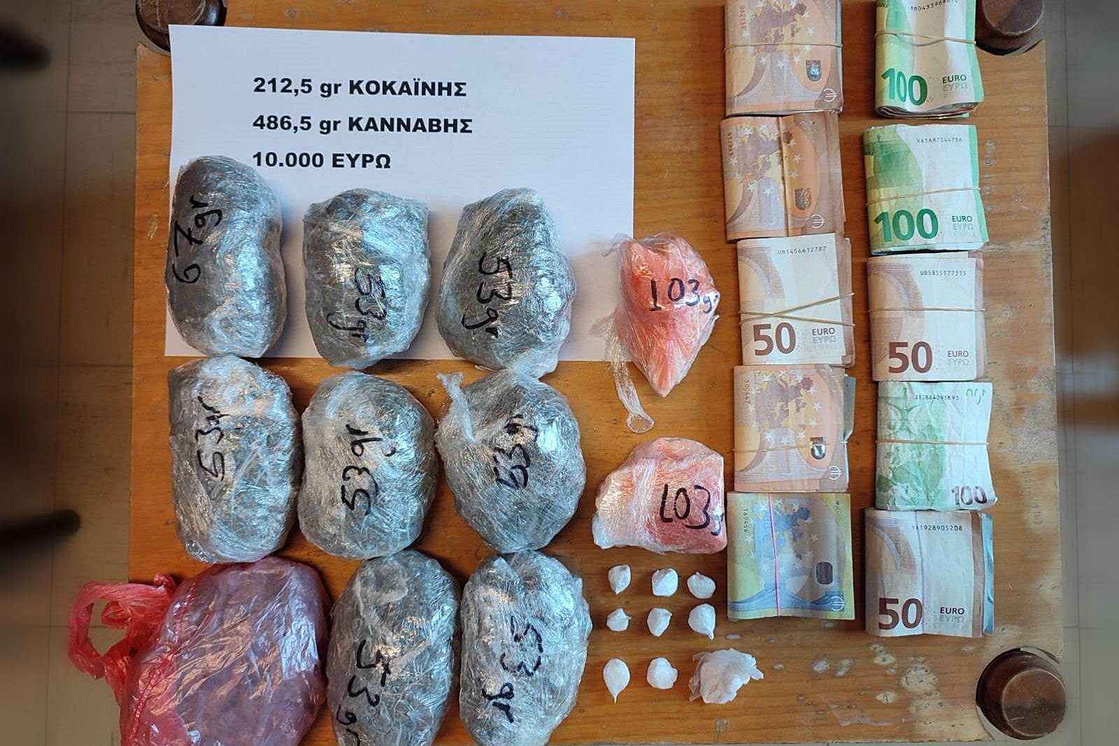 Κατασχέθηκαν 213 γρ. κοκαΐνη, 487 γρ. κάνναβη, ζυγαριές ακριβείας, Ι.Χ.Ε. αυτοκίνητο, 10.000€ κ.α.