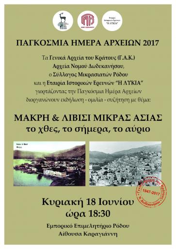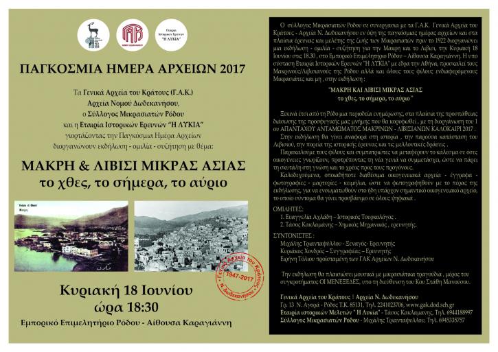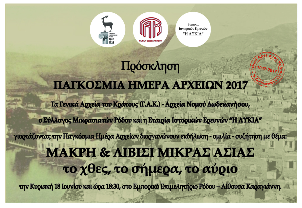 ΔΕΛΤΙΟ ΤΥΠΟΥ-Τα ΓΑΚ Αρχεία Ν. Δωδεκανήσου, ο σύλλογος Μικρασιατών Ρόδου και η εταιρία ιστορικών ερευνών "Η΄ΛΥΚΙΑ'' γιορτάζοντας την Παγκόσμια Ημέρα Αρχείων διοργανώνουν εκδήλωση-ομιλία-συζήτηση την Κυριακή 18 Ιουνίου 2017 στο Εμπορικό Επιμελητήριο Ρόδου – Αίθουσα Καραγιάννη με Θέμα: "ΜΑΚΡΗ ΚΑΙ ΛΙΒΙΣΙ ΜΙΚΡΑΣ ΑΣΙΑΣ . ΤΟ ΧΘΕΣ , ΤΟ ΣΗΜΕΡΑ , ΤΟ ΑΥΡΙΟ "
