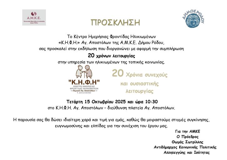 Με αφορμή την συμπλήρωση 20 χρόνων συνεχούς και ουσιαστικής λειτουργίας στην υπηρεσία των ηλικιωμένων της τοπικής μας κοινωνίας, το κέντρο «Κ.Η.Φ.Η. Αγ. Αποστόλων» της εταιρίας Α.Μ.Κ.Ε. Κοινωνικής Φροντίδας & Ανάπτυξης Δήμου Ρόδου, διοργανώνει εκδήλωση εορτασμού με θέμα