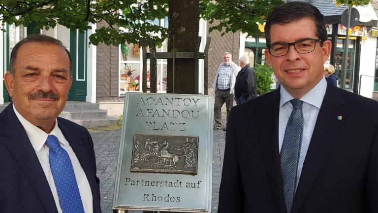 ΔΕΛΤΙΟ ΤΥΠΟΥ-Θέμα : Επίσκεψη του Δημάρχου Ρόδου κ. Χατζηδιάκου Φώτη στην πόλη Γκούμερσμπαχ -Η ανανέωση των σχέσεων συνεργασίας και η προετοιμασία μελλοντικών στοχευμένων κοινών δράσεων στον τομέα του πολιτισμού και του τουρισμού μεταξύ του Δήμου Ρόδου και του Δήμου Γκούμερσμπαχ της Γερμανίας βρέθηκαν στο επίκεντρο των συζητήσεων που έχει ο Δήμαρχος Ρόδου κ. Χατζηδιάκος Φώτης στην Γερμανία. Μοναδικές και συγκινητικές εμπειρίες επιφύλαξε κατά την διάρκεια επίσκεψης του Δημάρχου Ρόδου κ. Χατζηδιάκου Φώτη συνοδευόμενος από την Αντιδήμαρχο Τουρισμού κ. Χατζηλαζάρου Μαρίζα, στο πλαίσιο της συμμετοχής του δήμου Ρόδου στην έκθεση tour Natur στο Dùsseldorf, ο από μητέρα Ελληνικής καταγωγής, δήμαρχος της διδυμοποιημένης με τα Αφάντου πόλης Γκούμερσμπαχ κ. Φράνκ Χέλμενστάιν. Ο Δήμαρχος Ρόδου και η Αντιδήμαρχος ξεναγήθηκαν στην πλατεία Αφάντου που βρίσκεται μπροστά στον καθεδρικό ναό και το Δικαστήριο της πόλης, στους αναμορφωμένους χώρους των πρώην βιομηχανικών κτιρίων του Steinműller όπου είχαν εργαστεί εκατοντάδες μετανάστες από τα Αφάντου. Σήμερα το Γκούμερσμπαχ έχει γίνει υπόδειγμα οικιστικής ανάπλασης και ανάπτυξης στην Ευρώπη. Οι διαδικασίες αδελφοποίησης των δύο πόλεων ξεκίνησαν επί δημαρχίας Πανορμίτη Ράμμου και η επίσημη τελετή αδελφοποίησης των δύο πόλεων πραγματοποιήθηκε το 2001, επί δημαρχίας Σταύρου Σταυρή. Από τότε καλλιεργήθηκαν κυρίως σχέσεις σε επίπεδο πολιτιστικό με τη δημιουργία εκθέσεων, εκδηλώσεων αλλά και ανταλλαγή επισκέψεων και φιλοξενία παιδιών στις δύο πόλεις από τον τότε υπεύθυνο πολιτισμού και μετέπειτα δήμαρχο Αφάντου, τον σημερινό αντιδήμαρχο οικονομικών κ. Σάββα Διακοσταματίου. Τέλος, στην αίθουσα τελετών του δήμου επιβεβαιώθηκε η αδελφοποίηση και η συνεργασία των δύο δήμων, στο επίσημο χρυσό βιβλίο του δήμου που χρονολογείται από το 1850 και μεταξύ άλλων περιέχει και την από 5-7-1957 δήλωση του Κόνραντ Αντενάουερ ο οποίος διετέλεσε ως ο πρώτος μεταπολεμικός καγκελάριος της Γερμανίας (Δυτικής Γερμανίας) από το 1949 έως το 1963 ενώ υπήρξε επίσης δήμαρχος της Κολωνίας. Όπως δήλωσε ο κ. Χατζηδιάκος «Η επίσκεψη μου μόνο με αισθήματα συγκίνησης μπορεί να με κατακλύσει. Οι Αφαντενοί αποτελούν ένα σημαντικό κομμάτι της ιστορίας της πόλεως του Γκούμερσμπαχ καθώς έζησαν, πήγαν στα σχολεία, εργαστήκαν και διέδωσαν τον πολιτισμό, τις παραδόσεις και τα έθιμα μας σε αυτήν την πόλη. Το ταξίδι αυτό ήταν ιδιαίτερα εποικοδομητικό καθώς ισχυροποιήσαμε τους δεσμούς των δύο πόλεων, μια αδελφοποίηση που θα διαχέεται στις κοινωνίες των δύο πόλεων με δεσμούς φιλίας, συνεργασίας και αλληλεγγύης σε όλους τους τομείς, του πολιτισμού, της παράδοσης, της εκπαίδευσης αλλά και στο πολύ σημαντικό αλλά δύσκολο τομέα της τοπικής οικονομίας». Με την ευκαιρία ο Δήμαρχος Ρόδου, επανέλαβε την πρόσκληση του προς το Δήμαρχο Γκούμερσμπαχ για να επισκεφτεί και να γνωρίσει από κοντά την Ρόδο.
