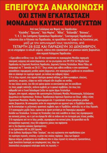 Από τους Συλλόγους και Φορείς του Παραδεισίου: "Κλεάνθης", "Ωρίωνας", "Αγία Μαρίνα", "Άθλος", "Βιλλανόβα", "Φοίνικας", "Ε. Κ. Σ. 3ου Συστήματος Προσκόπων Παραδεισίου", "Συνεταιρισμός Παραδεισίου", καλούνται όλοι οι Κάτοικοι του Παραδεισίου, να προσέλθουν στο Γραφείο της Κοινότητας μας, μαζί με την αστυνομική τους ταυτότητα, από Τετάρτη 28 έως και Παρασκευή 30 Δεκεμβρίου, για να υπογράψουν το κάτωθι κείμενο, ενάντια στην εγκατάσταση των μηχανών καύσης βιορευστών, στην περιοχή Καλαμώνα Παραδεισίου.