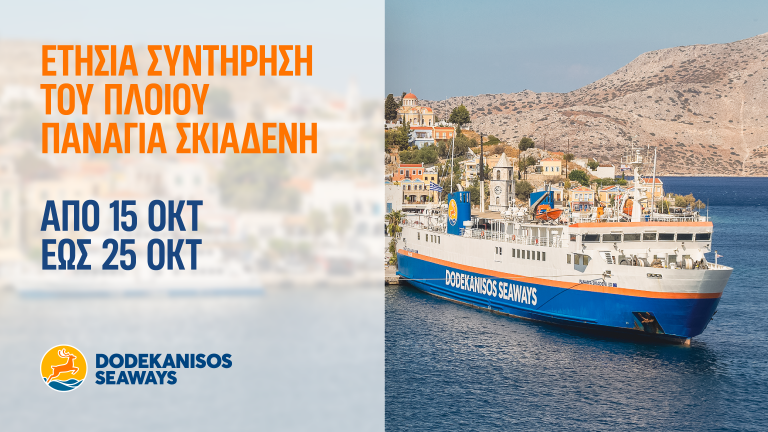 Η Dodekanisos Seaways σας ενημερώνει ότι για την περίοδο 15 έως 25 Οκτωβρίου το πλοίο «Παναγιά Σκιαδενή» δεν θα εκτελεί δρομολόγια, λόγω της ετήσιας συντήρησης του.