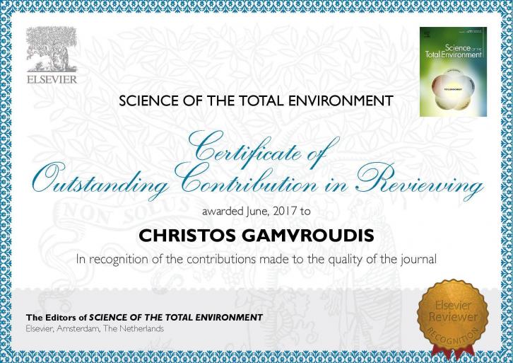 Ο παγκοσμίου φήμης εκδοτικός οίκος Elsevier καθώς και το επιστημονικό περιοδικό Science of the Total Environment - Journal σε θέματα επιστήμης του περιβάλλοντος, ευχαριστούν τον Δρ. Χρήστο Χρ. Γαμβρούδη, με πιστοποίηση, για την εξαιρετική συνεισφορά του, ως κριτή-διορθωτή, στα προς δημοσίευση άρθρα του περιοδικού. Είναι πρωτότυπες ερευνητικές επιστημονικές μελέτες-άρθρα, από διεθνή Πανεπιστήμια καθώς επίσης και μελέτες μεταπτυχιακών φοιτητών και υποψηφίων διδακτόρων.