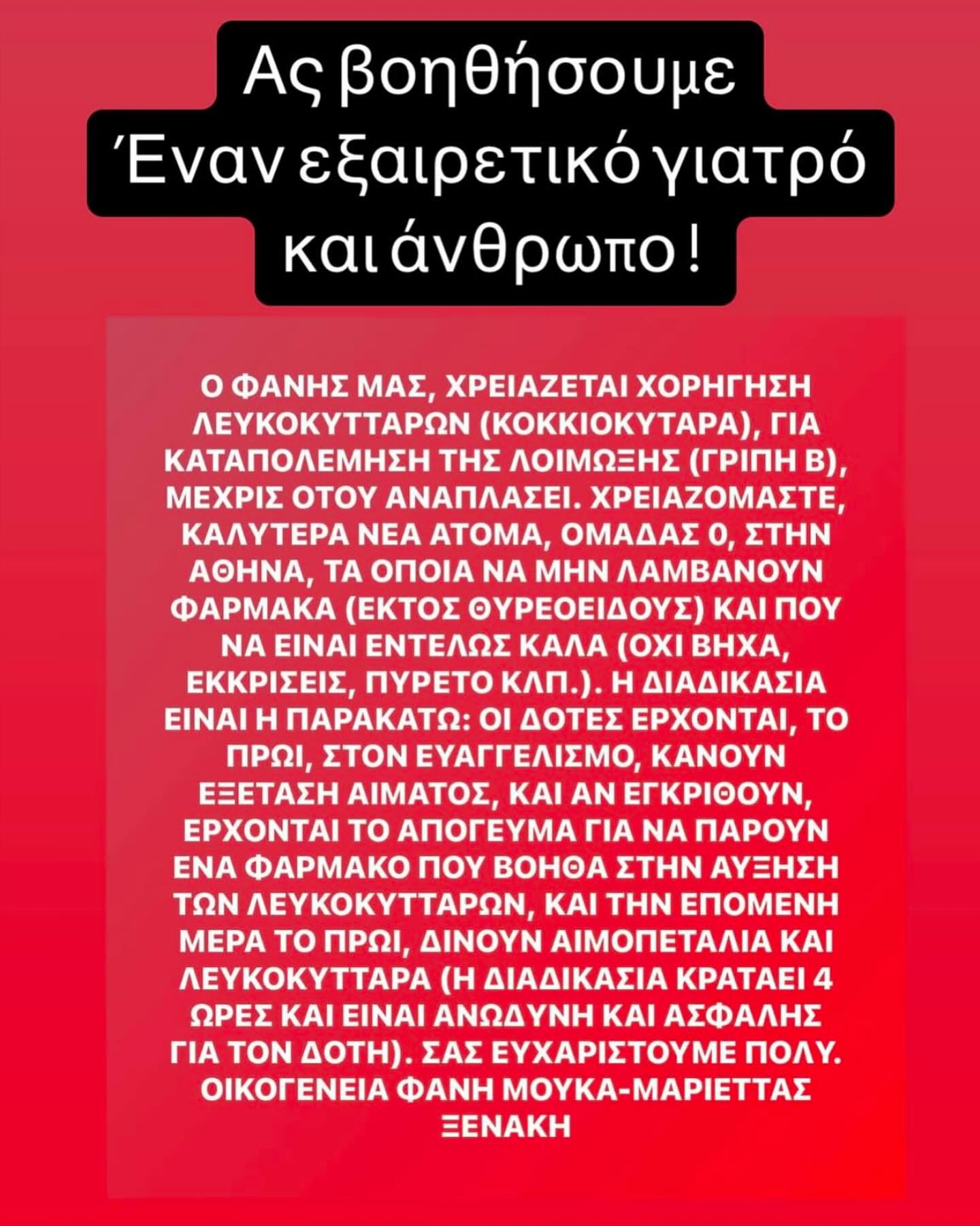 Στο νοσοκομείο "Ευαγγελισμός" νοσηλεύεται ένας φίλος και συνάδελφος 50 ετών, που έχει ανάγκη από λευκά αιμοσφαίρια και αιμοπετάλια.