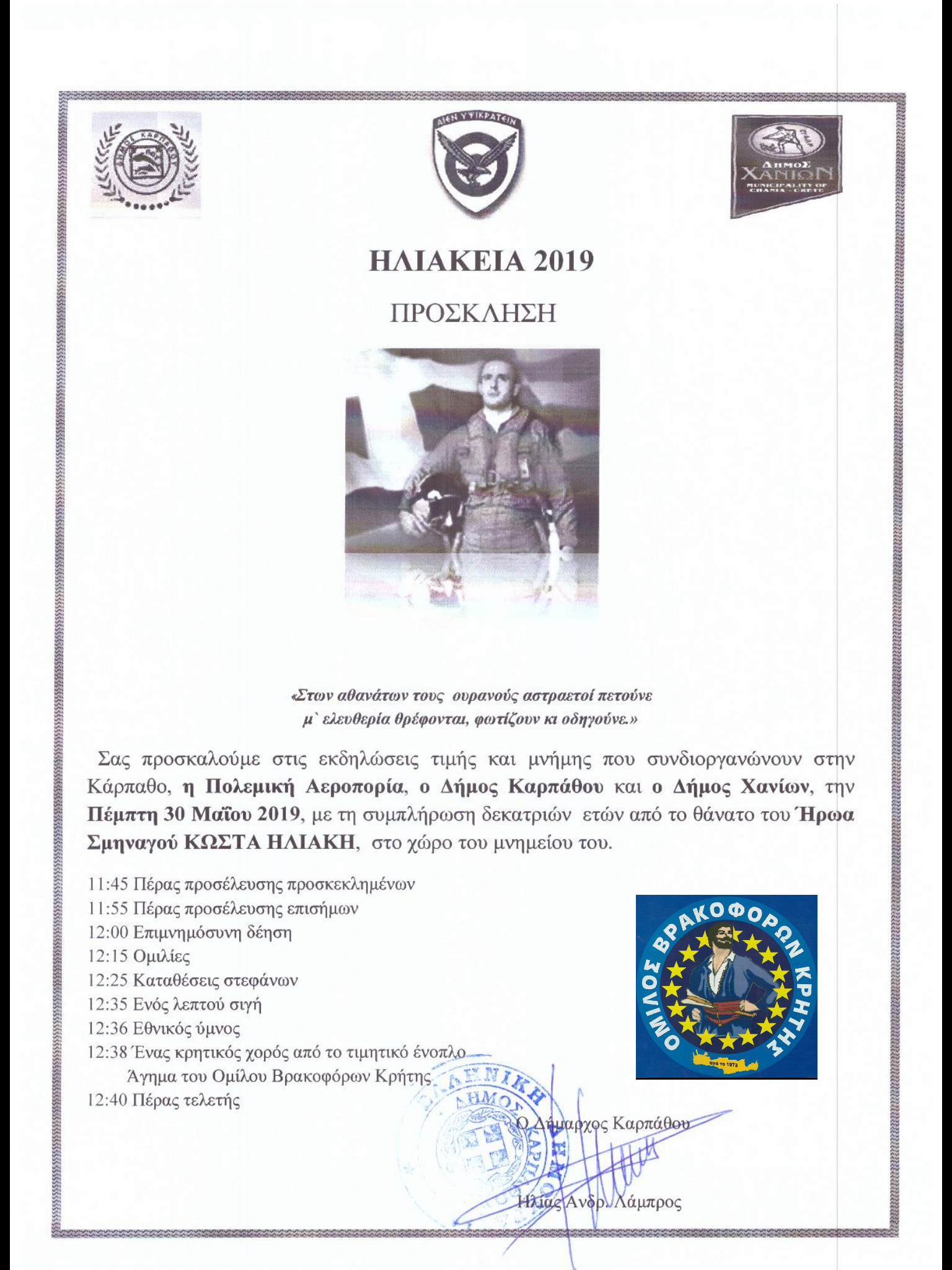 Σας προσκαλούμε στις εκδηλώσεις τιμής και μνήμης που συνδιοργανώνουν στην Κάρπαθο, η Πολεμική Αεροπορία, ο Δήμος Καρπάθου και ο Δήμος Χανίων, την Πέμπτη 30 Μαΐου 2019, με τη συμπλήρωση δεκατριών ετών από το θάνατο του Ήρωα Σμηναγού ΚΩΣΤΑ ΗΛΙΑΚΗ, στο χώρο του μνημείου του.
