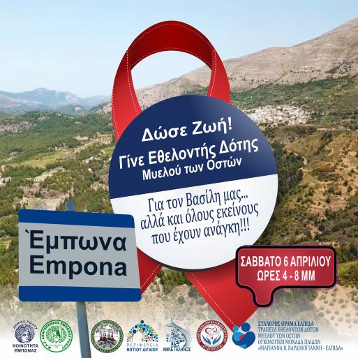 Η Κοινότητα Έμπωνας με τους Αθλητικό Σύλλογο "Αναγέννηση" και τον Πολιτιστικό Σύλλογο "Ο Αττάβυρος" της περιοχής, σε συνεργασία με την Περιφέρεια Νοτίου Αιγαίου, την ΑΜΚΕ ΓΑΛΗΝΟΣ, το Σύλλογο Αιμοδοτών Ρόδου και το ΟΡΑΜΑ ΕΛΠΙΔΑ της Ογκολογικής Μονάδας Παίδων «ΜΑΡΙΑΝΝΑ Β. ΒΑΡΔΙΝΟΓΙΑΝΝΗ - ΕΛΠΙΔΑ» διοργανώνουν ημέρα δωρεάς μυελού των οστών, το ερχόμενο Σάββατο, 6 Απριλίου 2024 στην Έμπωνα.