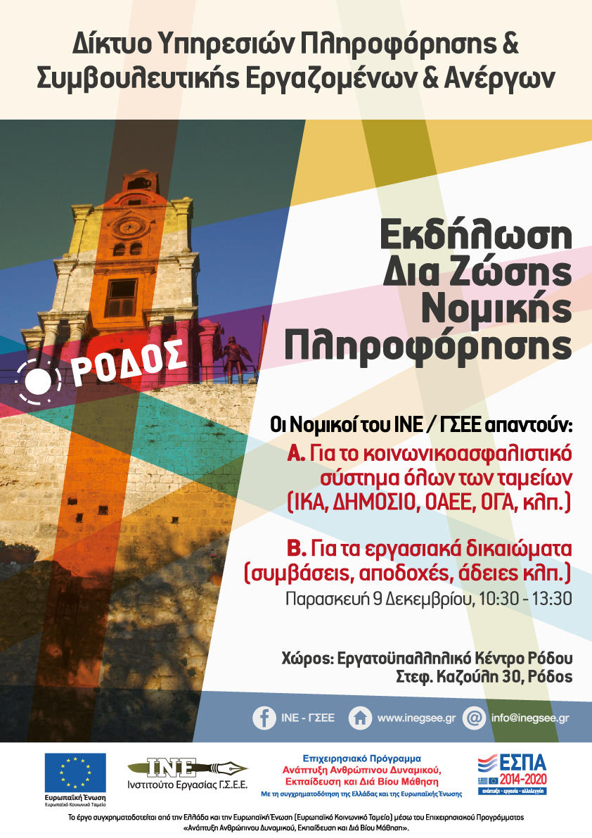 ΔΕΛΤΙΟ ΤΥΠΟΥ-Το Ινστιτούτο Εργασίας της ΓΣΕΕ / Περιφερειακό Νοτίου Αιγαίου - Δωδεκανήσου σε συνεργασία με το Εργατοϋπαλληλικό Κέντρο Ρόδου διοργανώνουν ημέρα υποβολής εργασιακών και ασφαλιστικών ερωτημάτων σε νομικούς συμβούλους.