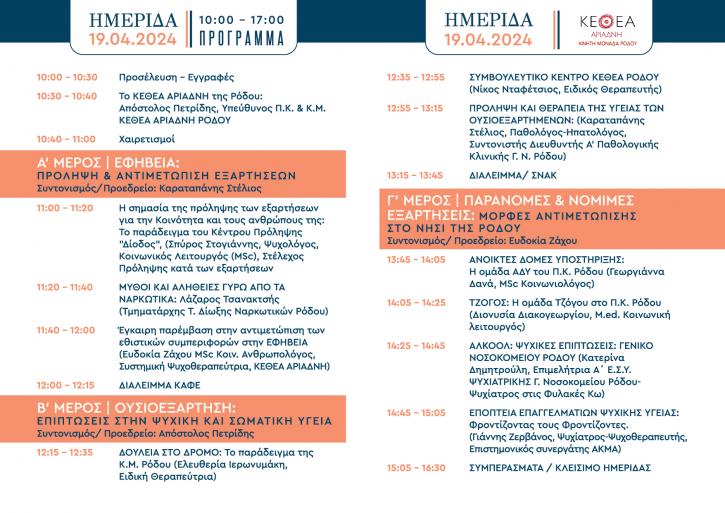 Θέμα: Ημερίδα από την Κινητή Μονάδα Ρόδου του ΚΕΘΕΑ ΑΡΙΑΔΝΗ με θέμα «Εξαρτήσεις: Αντιμετώπιση και Προκλήσεις στο νησί της Ρόδου»