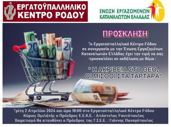Ημερίδα για την ακρίβεια, με θέμα «η ακρίβεια στον Θεό και οι μισθοί στα τάρταρα», διοργανώνει την προσεχή Τρίτη, σε συνεργασία με την Ένωση Εργαζομένων Καταναλωτών Ελλάδας, η διοίκηση του Εργατικού Κέντρου Ρόδου.