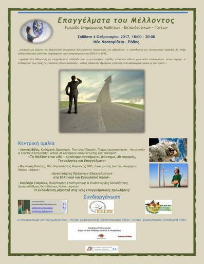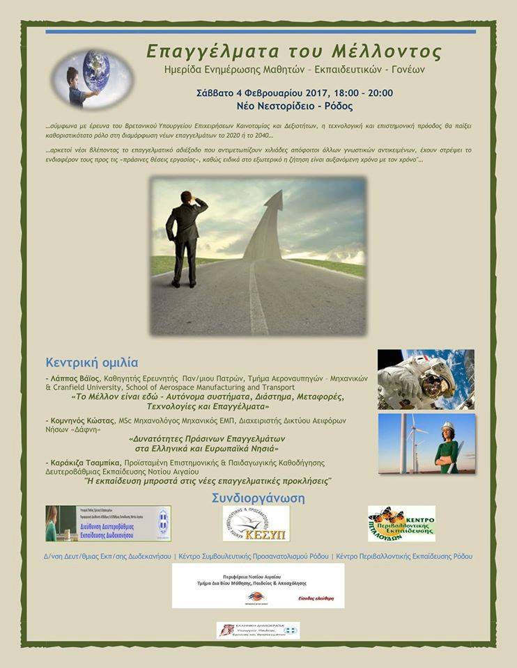 Ημερίδα Ενημέρωσης Μαθητών – Εκπαιδευτικών - Γονέων Σάββατο 4 Φεβρουαρίου 2016, 18:00 – 20:00 Νέο Νεστορίδειο - Ρόδος Το ΚΕ.ΣΥ.Π. Ρόδου, το ΚΠΕ (Κέντρο Περιβαλλοντικής Εκπαίδευσης) Πεταλούδων Ρόδου, η Διεύθυνση Δευτεροβάθμιας Εκπαίδευσης Δωδεκανήσου και η Περιφέρεια Ν. Αιγαίου-Τμήμα Δια Βίου Μάθησης συνδιοργανώνουν ημερίδα με τίτλο: «Τα Επαγγέλματα του Μέλλοντος». Η εκδήλωση θα πραγματοποιηθεί 4 Φεβρουαρίου 2017 και ώρα 6.00 μμ. στο Νεστορίδειο Μέλαθρο. Ομιλητές οι : Λάππας Βάϊος ,Καθηγητής –Ερευνητής Πανεπιστημίου Πατρών ,Τμήμα Αεροναυπηγών-Μηχανικών & Cranfield University, school of Aerospace, Manufacturing and Transport (UK). «To Μέλλον είναι εδώ- Αυτόνομα συστήματα, Διάστημα, Μεταφορές, Τεχνολογίες και Επαγγέλματα» Κομνηνός Κώστας, Μsc Μηχανολόγος Μηχανικός ΕΜΠ, Διαχειριστής Δικτύου Αειφόρων Νήσων «Δάφνη». «Δυνατότητες πράσινων επαγγελμάτων στα Eλληνικά και Ευρωπαϊκά νησιά» Καράκιζα Τσαμπίκα, Προϊσταμένη Επιστημονικής & Παιδαγωγικής Καθοδήγησης Δευτεροβάθμιας Εκπαίδευσης Νοτίου Αιγαίου. "Η εκπαίδευση μπροστά στις νέες επαγγελματικές προκλήσεις"