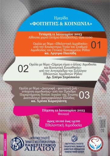 Τη Τετάρτη 11 Ιανουαρίου, ο Φοιτητικός Σύλλογος του Τμήματος Μεσογειακών Σπουδών σε συνεργασία με το Φοιτητικό Σύλλογο του Παιδαγωγικού Τμήματος Δημοτικής Εκπαίδευσης του Πανεπιστημίου Αιγαίου και το Σύλλογο Εθελοντών Αιμοδοτών Ρόδου διοργανώνει, Ημερίδα με τίτλο: “Φοιτητής και Κοινωνία".